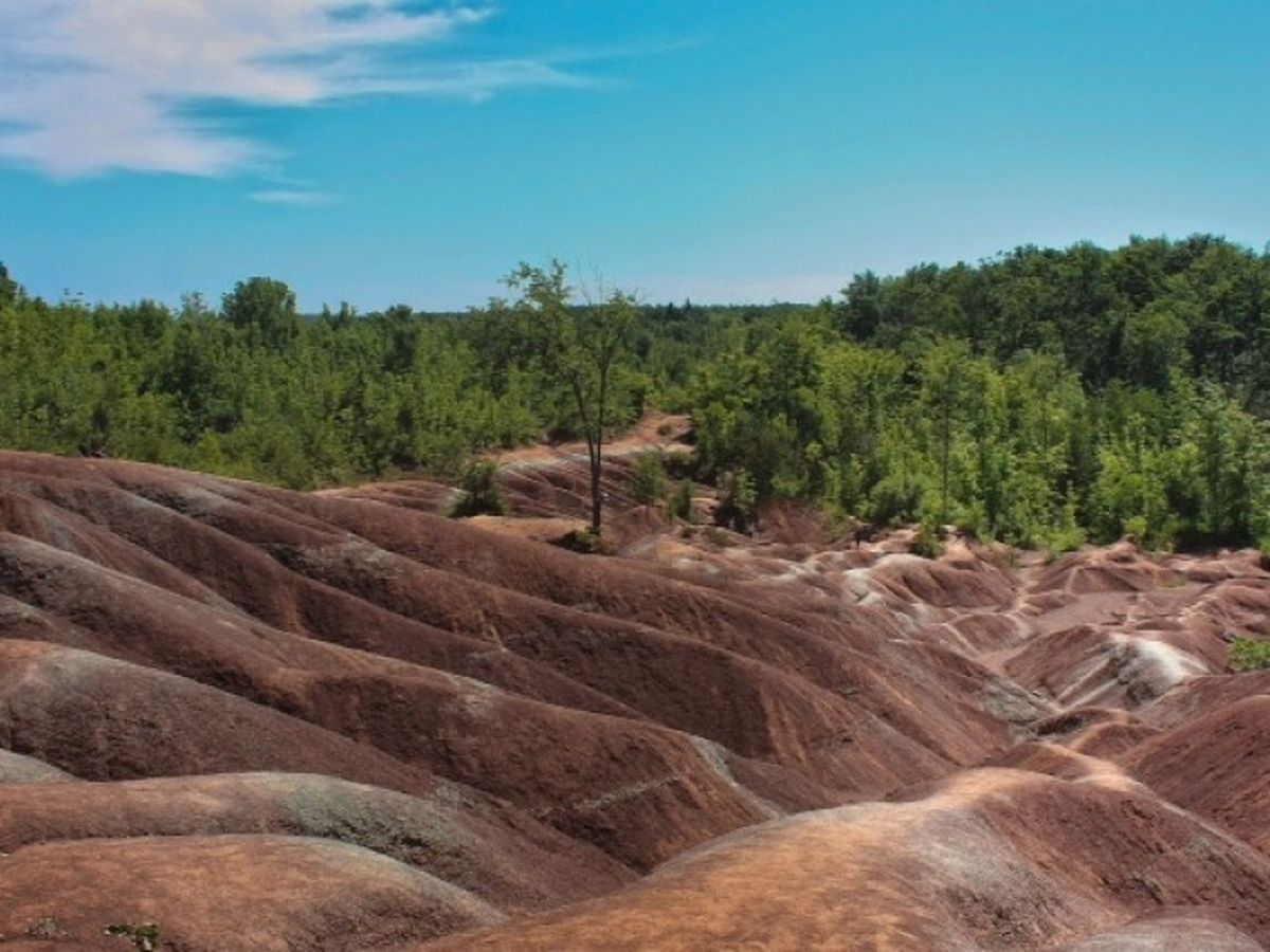 The Cheltenham Badlands are home to rolling hills of Queenston Shale that are over 400 million years old. This unique topography runs along Olde Base Line Road, and has seen increased tourism since 2000, when the land was purchased to be held in trust for the people of Ontario.