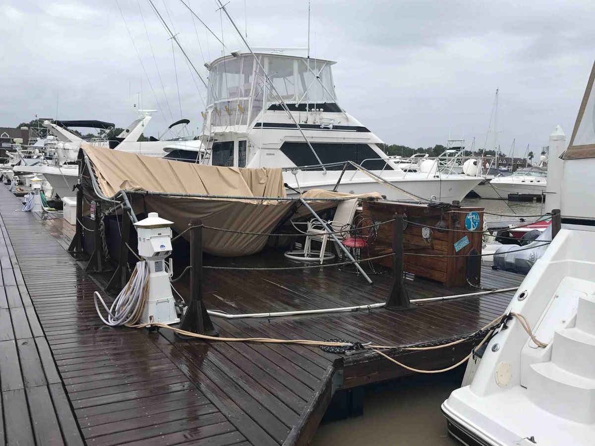 As you all know John Baker and I have owned the Pirates Porch over the last two years and it has become an important hang out for many of the brothers. It has hosted two Zaf's and any number of dock impromptu "get togethers"with many brothers always invited. John Baker and Myself have been personally funding this endeavor, to include the new canopy, the bar, the couch, grill maintenance and of course the monthly rent associated with keeping the porch. We have never turned anyone away and of course all BOC members are always invited and welcomed.Hurricane Harvey came and did quite a job on the porch. The canvas just could not hold the volume of water that collected. Once it started a small pool it just kept collecting until the shear weight of it bent and collapsed the 2" steel tubes of the frame completely tearing the structure down. I had some help from some of the Houston Brothers (Ken and JD) dismantling it and throwing it away today and I thank them!Here is where you can help. A simple one time donation to the porch will help us rebuild