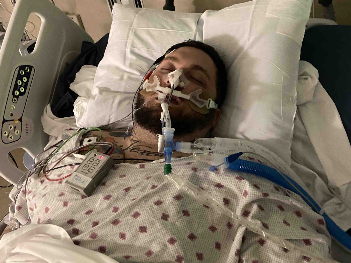 After a night in the ER they finally got him into the ICU. His oxygen saturation level was in the low 50’s and he had low blood pressure upon admission. He was put on a ventilator to breathe for him and put into a medically induced coma so his lungs could heal.