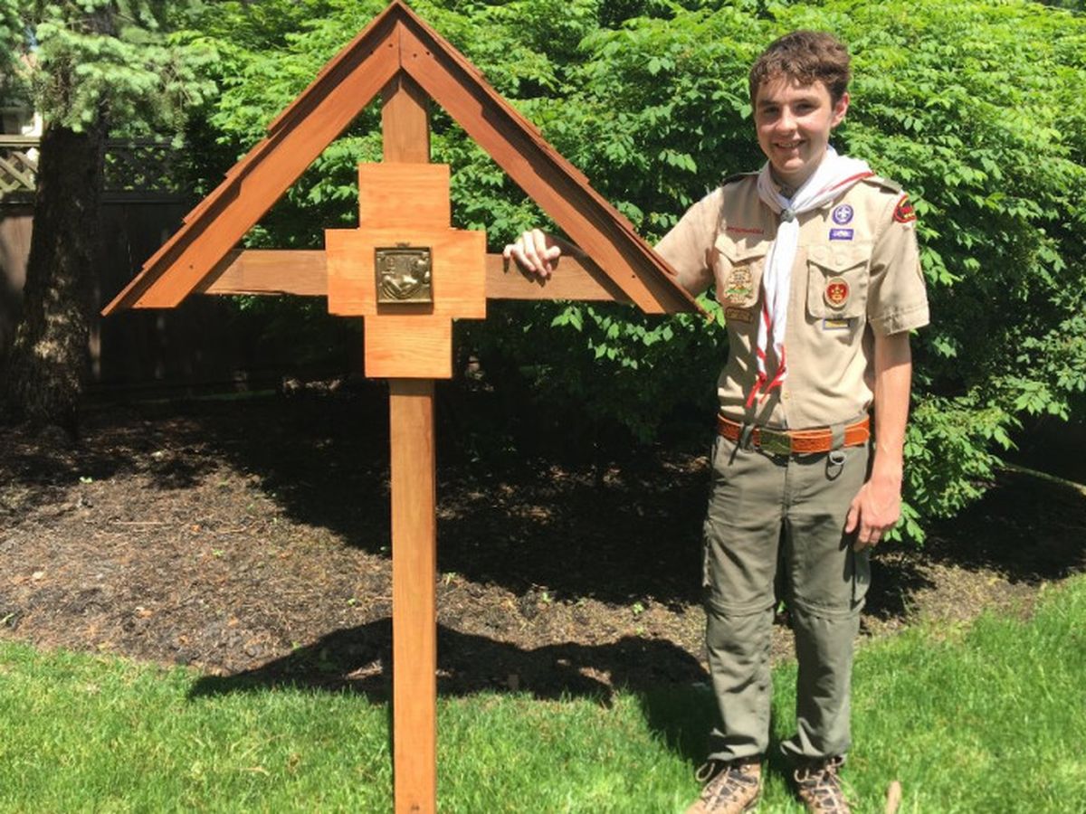 For my Eagle Scout Service Project, I have designed new outdoor Stations of the Cross for our Chuch after consulting with Fr. David, Fr. John and Architect Greg Blasi. We will be building the new Stations this Summer. Each of the 14 Stations will be made from cedar wood, stand 6 feet tall, and include a brass plate depicting the relevant scene from the Passion of Christ. The attached photo is a template that I built with my Uncle Brian, brother Terence, and my dad.