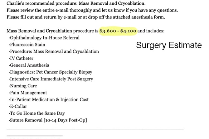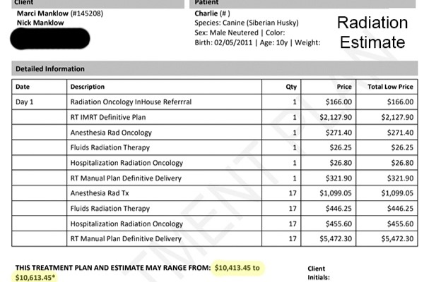 Then we got the estimates...one estimate for surgery, and a second for the radiation, which totaled $15,000 for the full treatment... to be paid at the time of service.