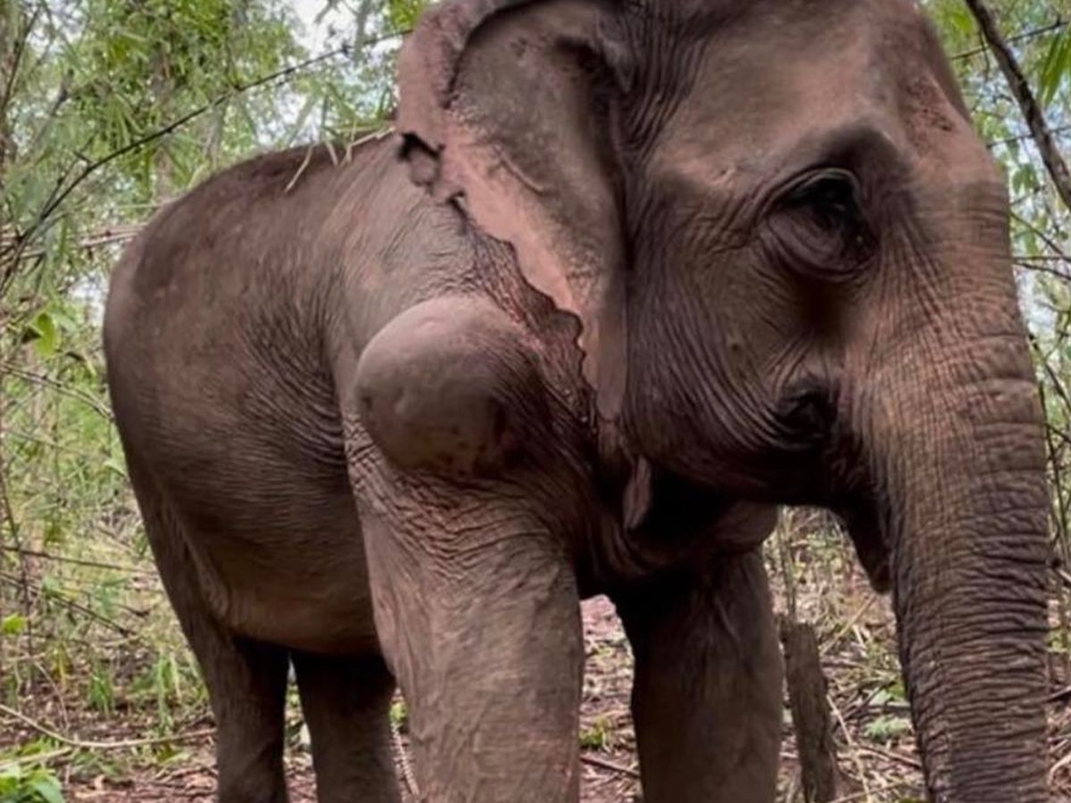 We found this young elephant abandoned in the woods, just chained to a tree. She was a logging elephant, but her logging harness rubbed a huge mass into her side, which forced her into an early retirement. So, her owner has abandoned her out in the middle of the woods. She is chained to a tree, stuck out there all day and night by herself. It's super sad.