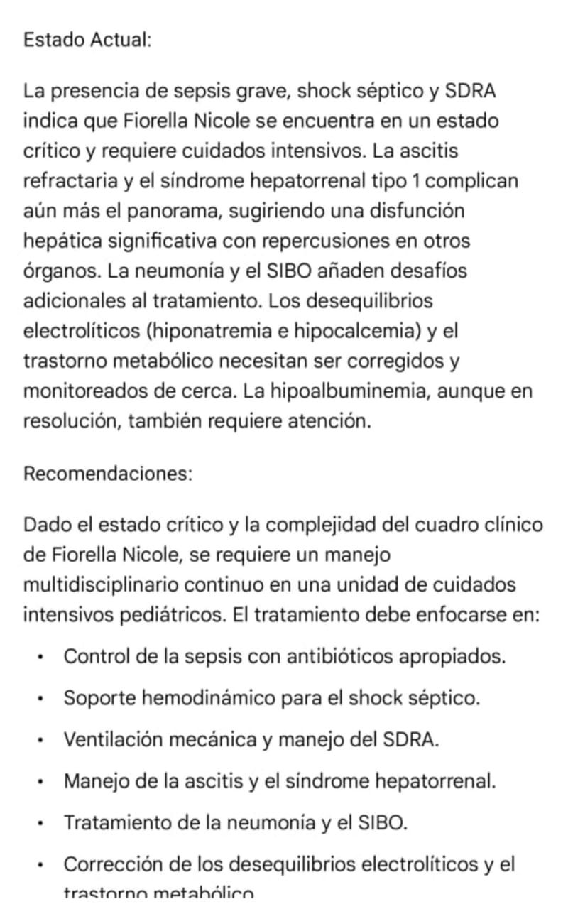 Con el corazón aún más oprimido al ver este informe médico, al ser testigos de la realidad tangible del sufrimiento de Fiorella Nicole Pérez Mayora, de tan solo 5 años, nuestras palabras se tiñen de una urgencia aún mayor. Desde aquel diciembre que ahora se siente eterno, esta pequeña guerrera ha enfrentado un diagnóstico que estruja el alma: Síndrome ictérico obstructivo, Ectasia de vías biliares intrahepáticas, Litiasis en colédoco y un postoperatorio tardío de coledocoenterostomía.