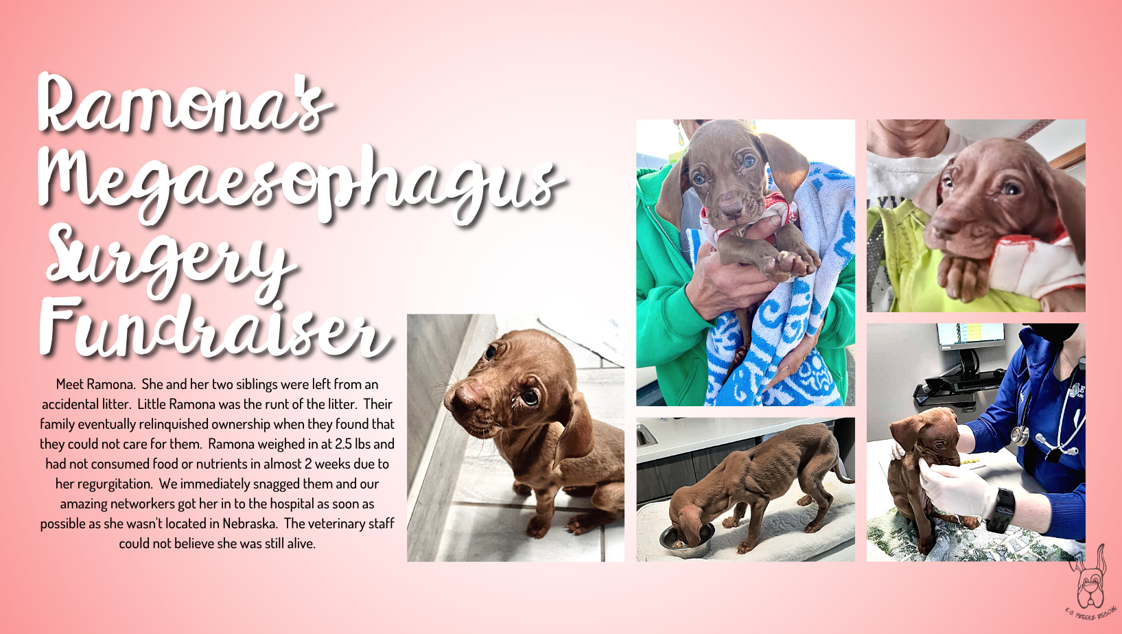 Now our Earth Angel and networker is spending countless hours holding this sweet little nugget upright as she slowly feeds her a special diet. Ramona had gained 3 ounces but sadly lost an ounce and was rushed back to the hospital as she’s not keeping down her formula. If you can please help this little sweetie in giving her the opportunity to grow and find her forever home as every puppy should we would be forever grateful!