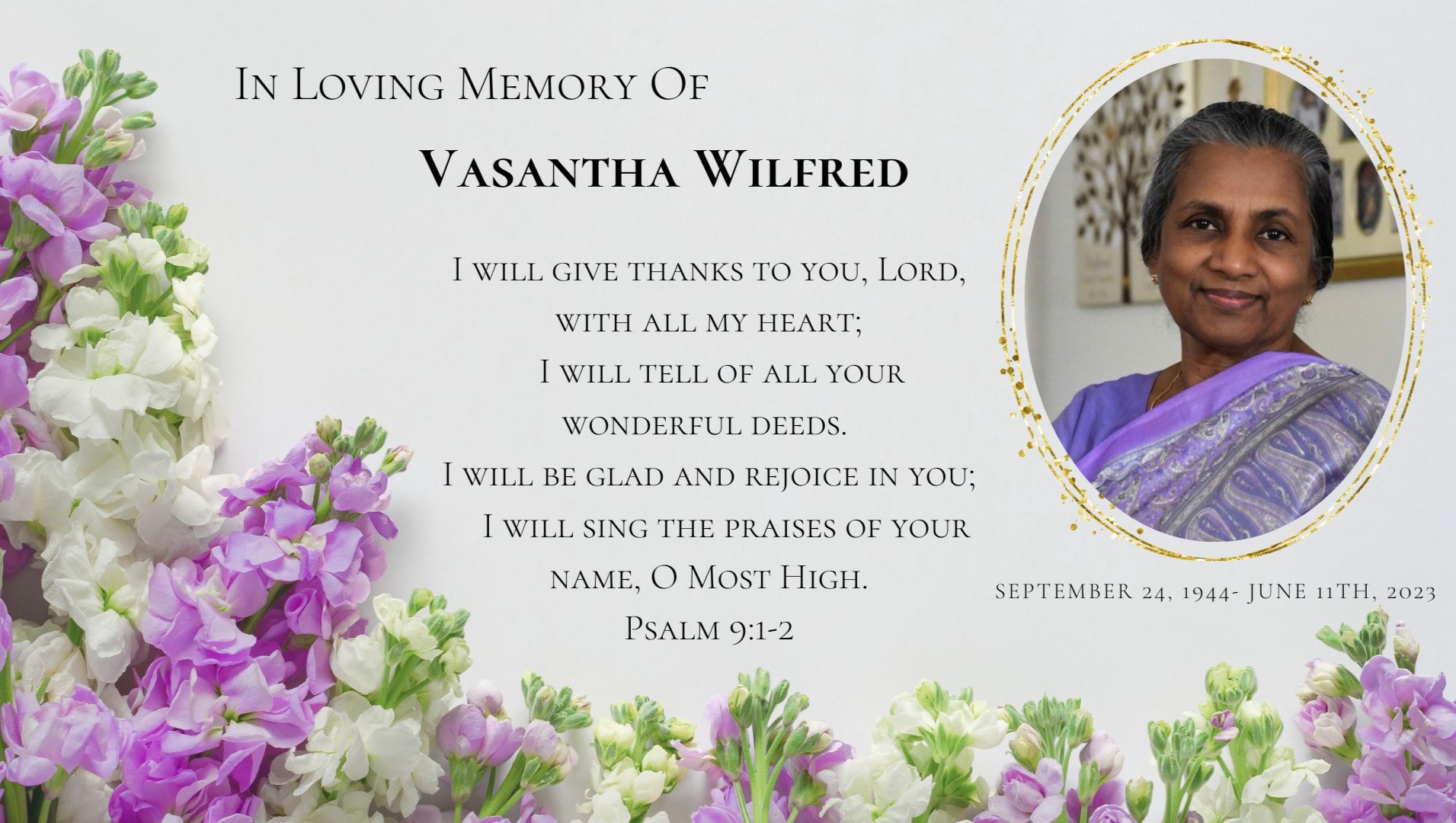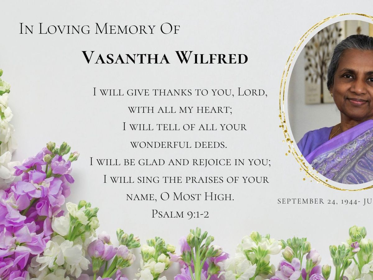 Vasantha Wilfred went home to be with her Lord and Savior Jesus on Sunday, June 11th, 2023. She was a loving wife, sister, mother, and grandmother. She was a very caring and compassionate person who reached out to many who were hurting as an overflow of her love for Jesus.