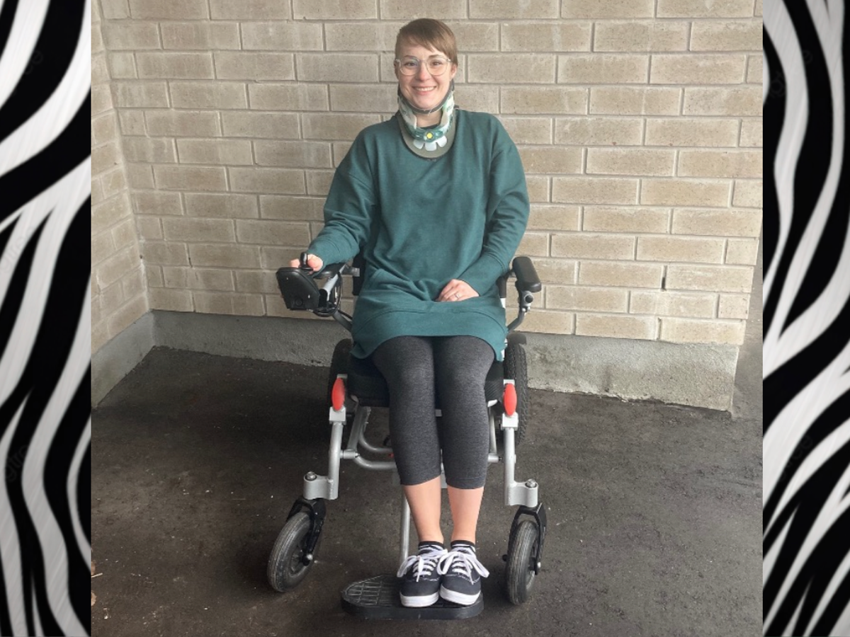 Hi, my name is Kaitlyn, and I am a Zebra. If you don’t already know, a Zebra is someone with Ehlers Danlos Syndrome (EDS). EDS is a rare genetic condition that affects all the connective tissue in your body. This causes a lot of problems including instability in your joints. My neck is my most badly affected area. Long before my EDS was diagnosed, I had surgery on the base of my skull that has only caused worse neck instability. Now I can no longer hold my head up for very long. I am in constant pain. Even with a special neck brace, I can only remain upright for a couple of hours a day. I spend most of the time lying down or reclining with my head supported. My neck instability compresses my spine, which causes damage to my nervous system that is getting progressively worse. I need a wheelchair to go even a short distance or to be on my feet for more than 30 minutes. I cannot work. Basic tasks like cooking and taking care of myself are painful and difficult.