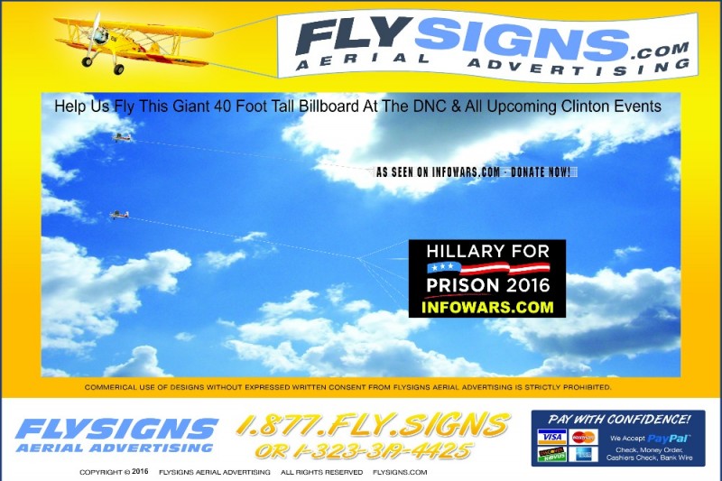 As seen on InfoWars.com. Help us generate enough money to fly this giant 40 foot tall HILLARY FOR PRISON 2016 billboard around 35 of her upcoming events. All funds will go directly to 3 hour flights at Clinton events and rallys, as well as debates. We will add more signs, more airplanes and more flight hours from your donations if the goal is met and surpassed. Please help put this corrupt and protected criminal behind bars!