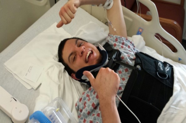 "Aaron had a terrible fall and landed on his back which burst his L3 vertebra. He had to have major back surgery -a corpectomy. A corpectomy means that they removed the fractured vertebral body and inserted an implant. Then they had to span the vertebral body with screws and rods to stabilize the region. Over time bone will fill in and fuse the neighboring vertebral bodies. Aaron is home now, is coping with the pain and will be having a full but slow recovery."