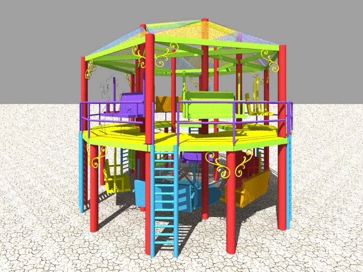 Circus Fabulae is a two story swing set with beautiful, custom designed mosaic roof and circular play space for performances of all kinds. At it's a heart a community space produced by a community of artists for the community to interact on. Circus Fabulae is a whimsical colosseum structure of telephone poles two levels tall and 30' in diameter. Ladders are installed along the outside structure so that people can get up and down. The first level has six porch swings facing inward onto a circular performance space. The second level has six porch swings all facing outwards that can pivot inward to view the performances below. The ceilings will be etched/laser-cut panes of plexi-glass to give a stained glass effect. The floor and ceiling above the center performance space is cut away to give a view through to the sky above. Each swing and roof panel will be designed and executed by a different artist or group. On the inside of the entire structure for participation encouragements will be written like "Tell a story" or "Play telephone", in the hopes that the community will take the lead and initiate an interactive exchange.