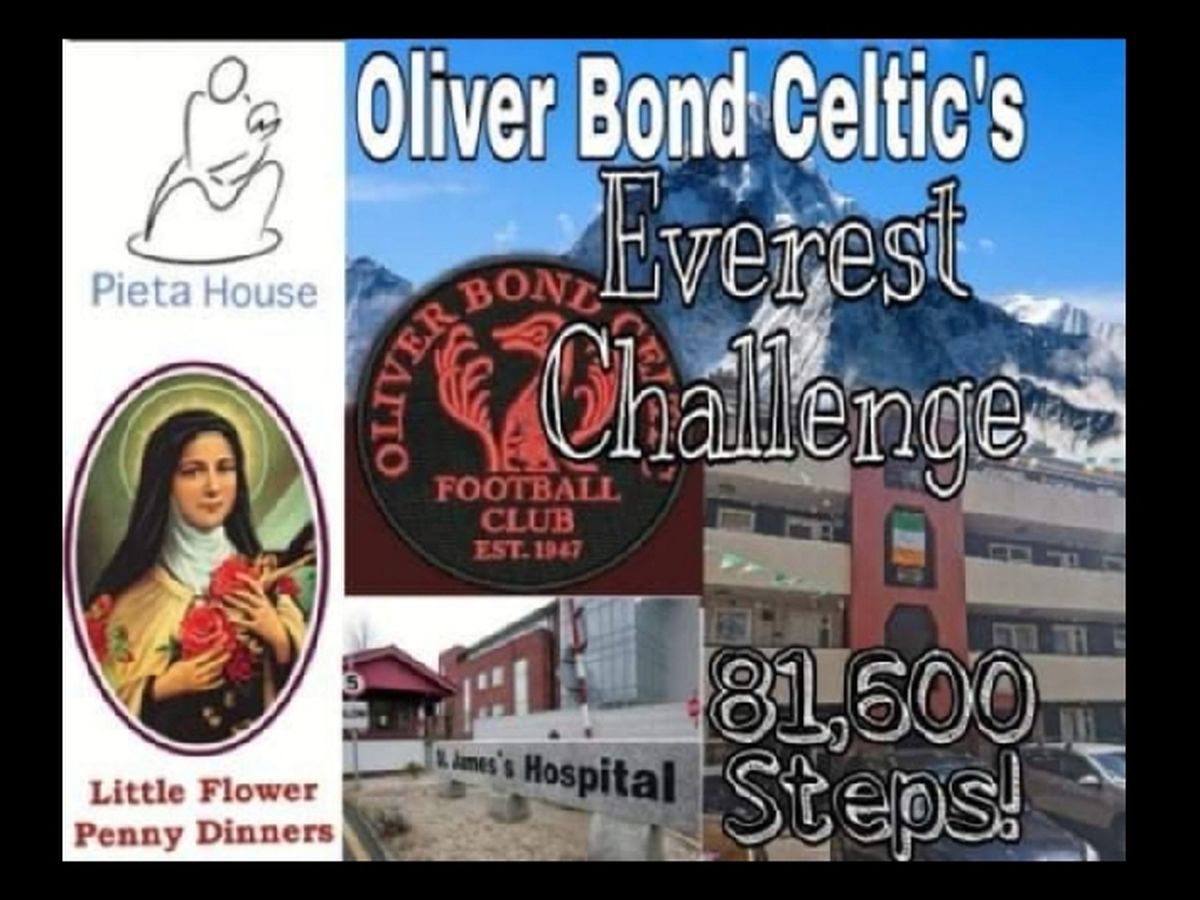 Myself, John Lynch and Oliver Bond Celtic coach Eddie Keogh were discussing ways to raise money for the front line workers in James's Hospital, Pieta House in memory of everyone we've lost from the flats, The Robert Emmet centre, Liz O Connor, The Little Flower and The Liberty Soup run and we seen the great idea the lads came up in Ringsend with the Everest Challenge which involves climbing the stairs in their flats 880 times. So we came up with the idea to do the same in Oliver Bond which has 17 sets of stairs. 1 man per block up and down 100 times. This equates to 81,600 steps climbed in one day Weve had a great response to people wanting to do the challenge with lads from Oliver Bond Celtic football team, committe and locals going to take part with myself, John and Eddie. Well be looking to do the challenge in a couple of weeks and any donations would be greatly appreciated