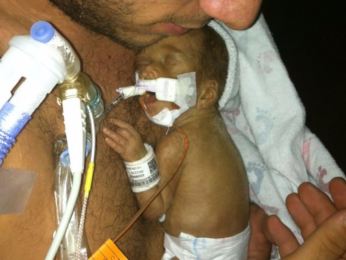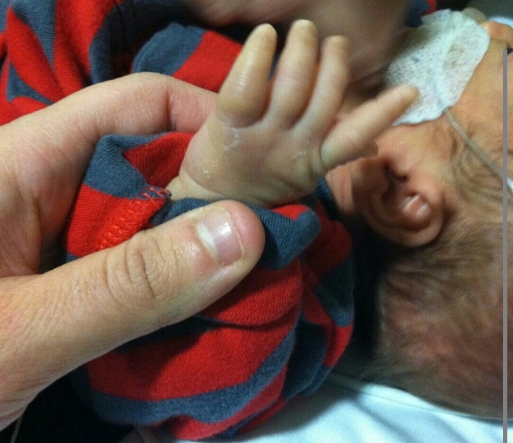 He is so fragile, his skin transparent with fingers and toes that looked like Q-tips, so tiny. Although he would open his mouth; you wouldn't hear a sound; he couldn't cry because the life support was breathing air for him and the feeding tube was through his tiny nose.  You can see above that his father's hand could cover his entire body.