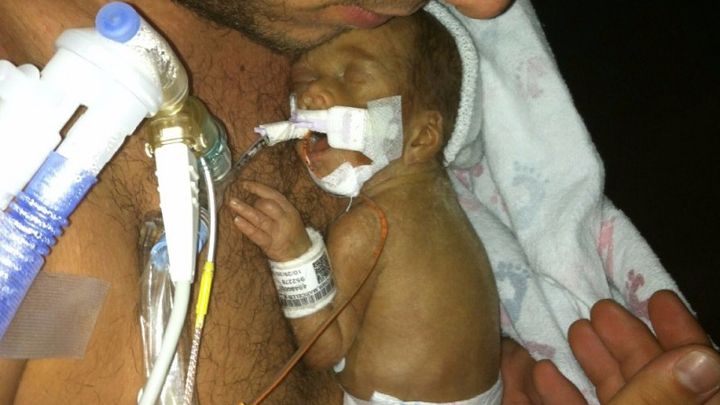 His first diaper was literally comparable to the size of a cell phone; and yet was still TOO BIG for his tiny body.  His blood pressure cup on his ankle could fit as a ring for a grown man.  Alicia and Tyler could not hold their baby for a few weeks. It wasn't safe for Cello to be outside of the protection of the incubator's warmth and exposed to germs; but their love flowed through to their child through the hand holes of the incubator as they gently caressed his delicate hand as his mother sang to him.  You can see how tiny he is...