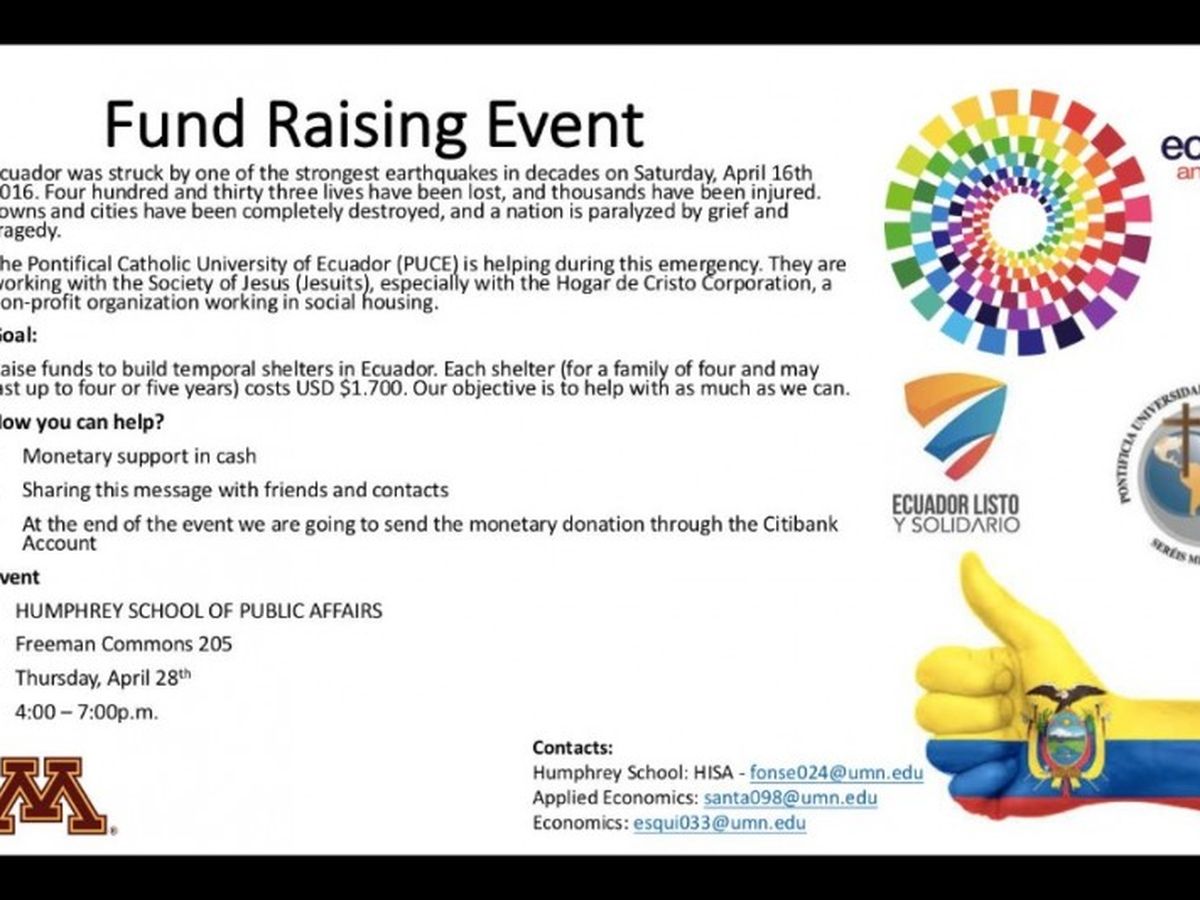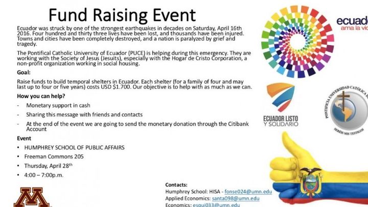 Humphrey International Student Association (HISA) is hosting a fund raising event and collaborating with the Pontificia Universidad Católica del Ecuador to support building a temporal shelter which costs $1,700 each . These temporal shelters can provide a home for a family of 5 up to 3-5 years! We hope to raise enough funds to support two temporal shelters. Thanks for your support!