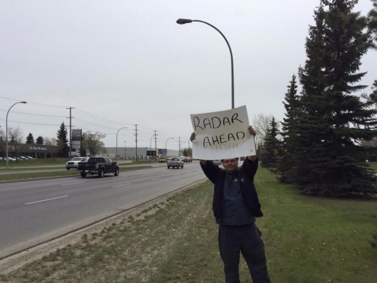 Jack Shultz was given a $543 pedestrian stunting ticket by the Edmonton Police Service earlier this month, for holding a 'Radar Ahead' warning sign for motorists hoping to avoid getting nabbed by one of the many photo radar trucks lining city streets.