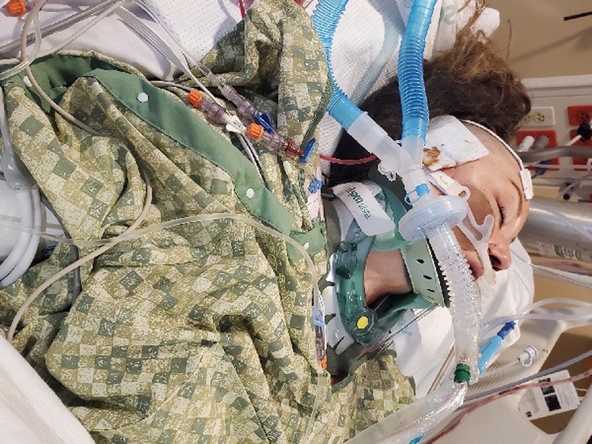 She has a fractured vertebrae in her neck, multiple facial fractures, and damage to the T4-T7 vertebrae in her back. She is not currently conscious or coherent.