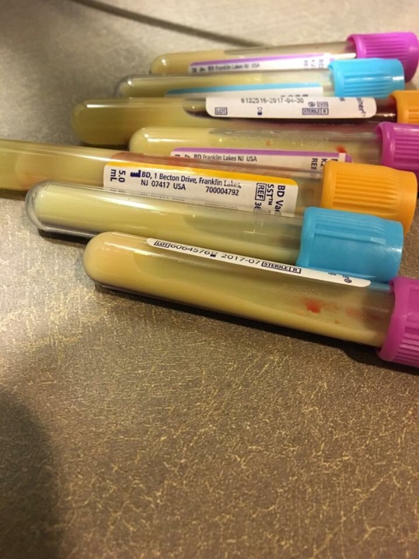 As many of you already know Niki unexpectedly had to go to East Alabama Medical Center on the evening of Sunday July 10th secondary to sever abdominal pains. Her exact words to me were "I swear I'm dying headed to hospital". Because of the amount of pain she was in this was about all I could get out of her. No real explanation which worried me even more. Of course these are not words any family member wants to hear especially when there is an unborn child involved as well. You immediately begin to worry about not only your loved one but also the little miricale who is helpless inside your loved one who's wellbeing determines her fate. At the hospital the main goal was to get Niki's pain under control (which took almost a full day) and determine the cause. The words gallbladder and bowel obstruction were tossed around. They finally came to the conclusion she had pregnancy induced acute pancreatitis due to EXTREMELY high triglycerides. This is a rare condition only affecting 1 out of every 10,000 pregnancies. Coincidentally 10,000 was also the number of her triglycerid level. Normal levels are between 100-200. Anything above 500 increases your risk of heart attack and stroke. They described her blood as milky as you can see in the picture below. It was clotting before it could even be tested. They also determined Niki developed pneumonia and required oxygen. Her hemoglobin levels are decrease and white blood cells have increased signaling infection. Because of the rarety and severity of her condition UAB wanted her in their care immediately. In the middle of the night they made quick arrangements for Niki to be taken by life flight helicopter to UAB. Once arriving at UAB several teams of doctors began her treatment plan which involves oxygen, pain meds, and most importantly plasma exchange to remove the triglycerides from her bloodstream. Because of the elevated triglycerid level oxygen cannot adequately travel to her pancreas via blood steam. Niki has began to feel much better following 2 plasma exchanges and currently has a catheter in her neck that will continue to stay there in case she may need more treatments. She continues to have pain secondary to the pancreatitis that sometimes even radiates up into her left shoulder. Her triglycerides are below 1,000 and she has begun a "clear liquid" diet. She has been transferred out of ICU into a long term high risk floor of the hospital where she will stay until Lydia is born. At this point they estimate she will be there for about 3 more weeks. Lydia is doing great so far and has been a rock star throughout this whole process. However, expenses are adding up very quickly. UAB has already approached them with a bill and they have only just arrived. Niki and Reggie are both unexpectedly out of work. Reggie plans to try to return Monday if possible. They not only have medical bills from 2 separate hospitals and one expensive helicopter ride but parking in downtown Birmingham is very expensive as well. Reggie is having to buy all his meals on the go and gas for driving back and forth from their home which is over a 4 hour drive round trip. Because of these expenses we are asking for your help. Many people have asked in what way they can help and I believe aside from the amazing amount of prayers that are covering their family financial support is second on the list at this time. Please do not feel pressure to donate. This is for people who feel led to give and help in this particular way. Every single dollar will help and is very much appreciated. The donation goal that has been set is a very rough estimate of their expenses. It could possibly be way more or very doubtfully less. Thank you every single one who has been praying and we thank you and ask that you please continue to pray until Niki and Lydia make it home safe and sound. There is still the road to delivery ahead and we pray only good things are to come.