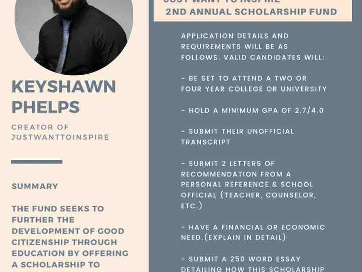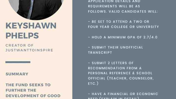 The Just Want to Inspire Fund was created by Keyshawn Phelps who is a first generation college graduate from Newark, New Jersey looking to motivate & inspire others to reach their true potential. The fund seeks to further the development of good citizenship through education by offering a scholarship to individuals of good character and in need of the scholarship. This scholarship can be used to assist high school students heading to their first year with tuition, fees and/or books and supplies. This is a start to an impactful Scholarship Fund that will grow to help many Individuals on their educational journey. The scholarship Committee will then have a application process to pick two candidates (Male & female) from Newark, New Jersey that are senior in High School and set to attend a college or university in the Fall. Both scholarship winners will receive $1000 !!!!!