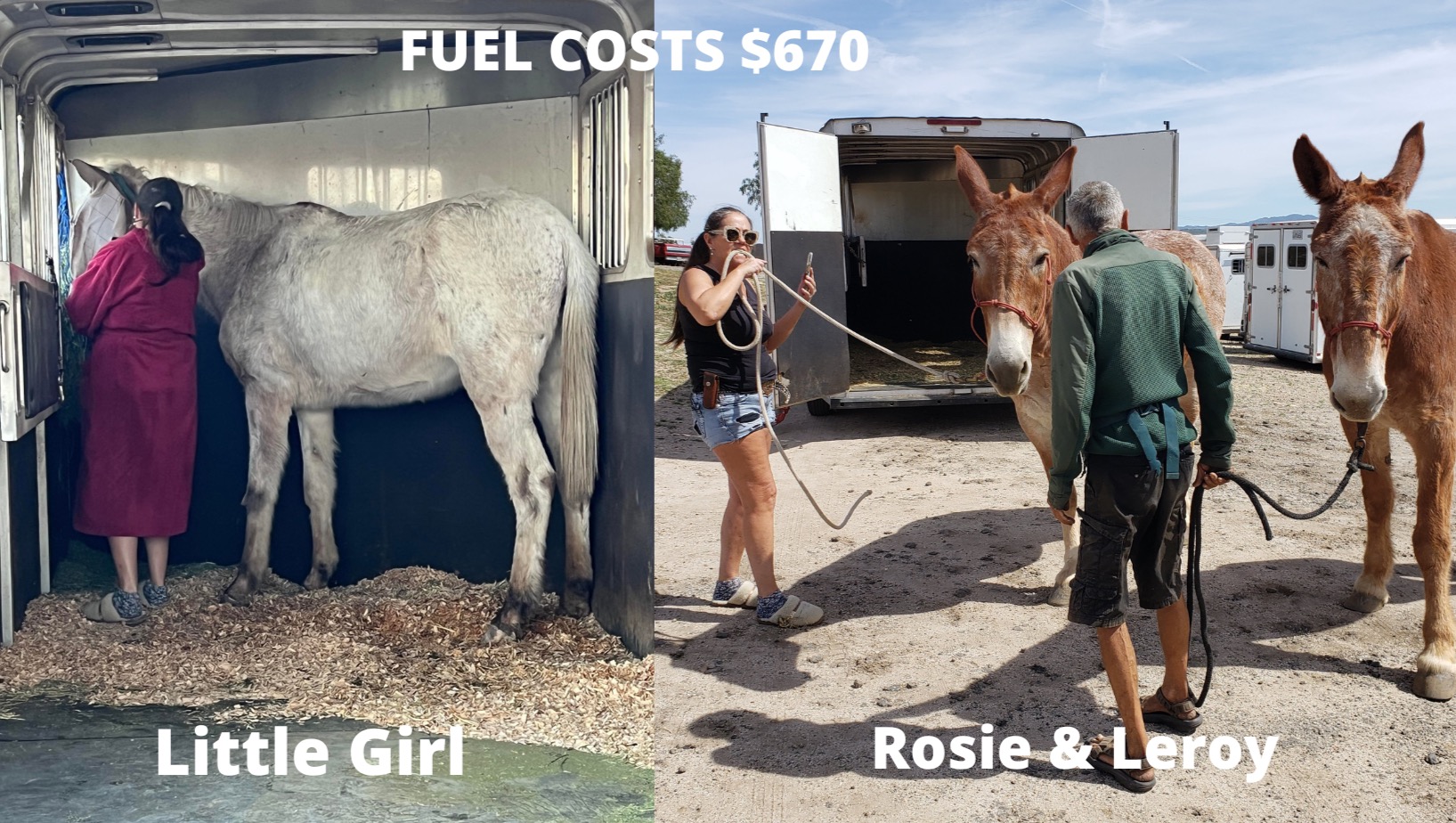 - $670 FUEL COSTS FOR HAULING MULES: 1) Little Girl - left Bakersfield, picked up Little Girl in Carpinteria, and returned to Bakersfield (272 miles; gas cost $220). Left Bakersfield delivered Little Girl to Auburn, returned to Bakersfield (312 miles - gas cost $270); 2) Rosie and Leroy - left Bakersfield, picked up Rosie and Leroy in Moorpark, and returned to Bakersfield (212 miles - gas cost $180).