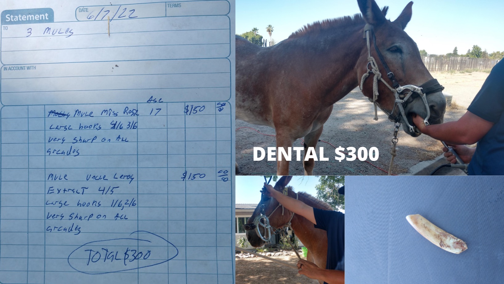 - $300 DENTISTRY: Pulled Leroy's tooth; floated both Leroy and Rosie