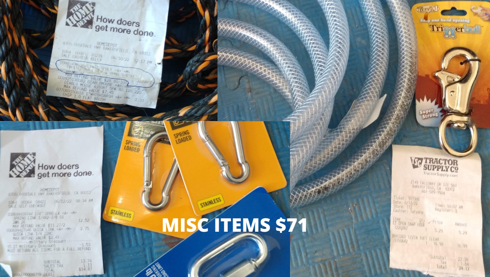 - $71 MISC ITEMS: Rope 100 FT $32; Vinyl Hose and Bull Snap $24.12; 3 Links $14.87