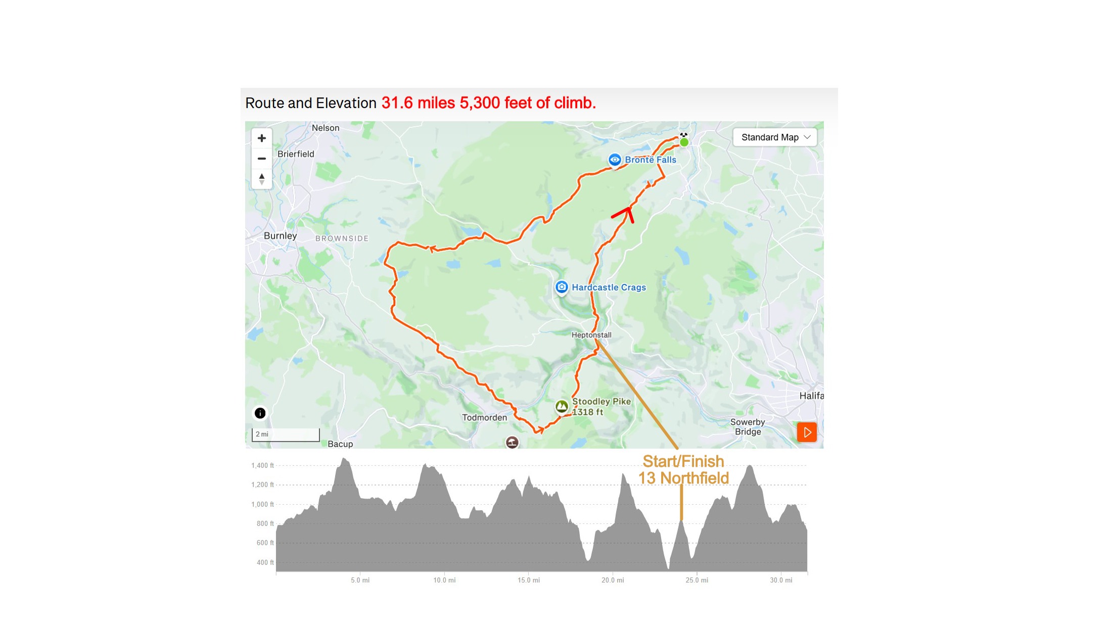 Then over the moors passing 7 reservoirs including Widdop and Hurstswood to the Long Causeway, Todmorden, the upper Calder Valley monument of Stoodley Pike, Hebden Bridge and then up the Cuckoo Steps to the finish in Heptonstall.