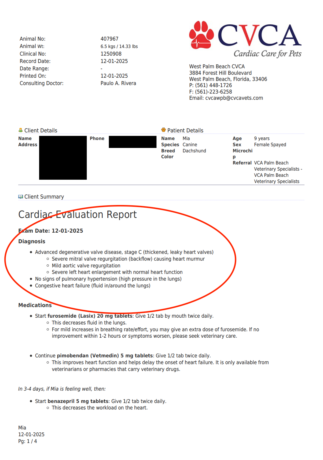 A few days ago, she suffered her first-ever cardiac episode. We rushed her to the emergency room, where we learned that Mia has Stage C mitral valve disease, a serious heart condition that causes fluid to build up in the lungs and can become life-threatening.