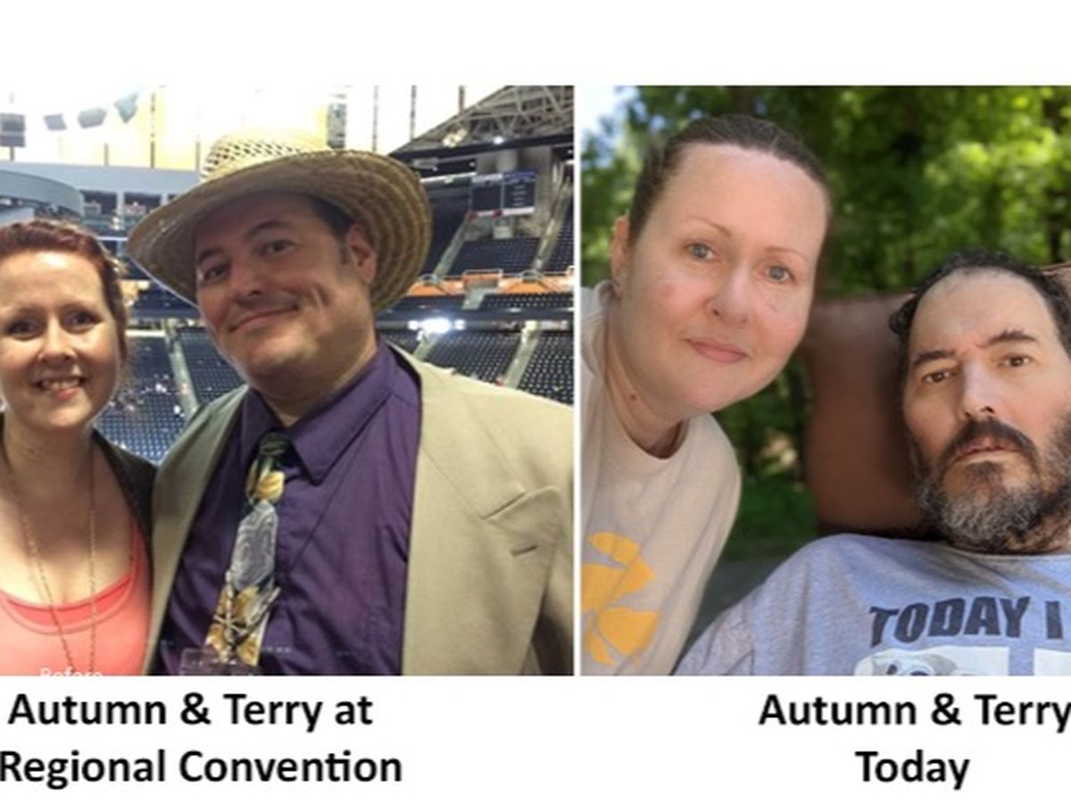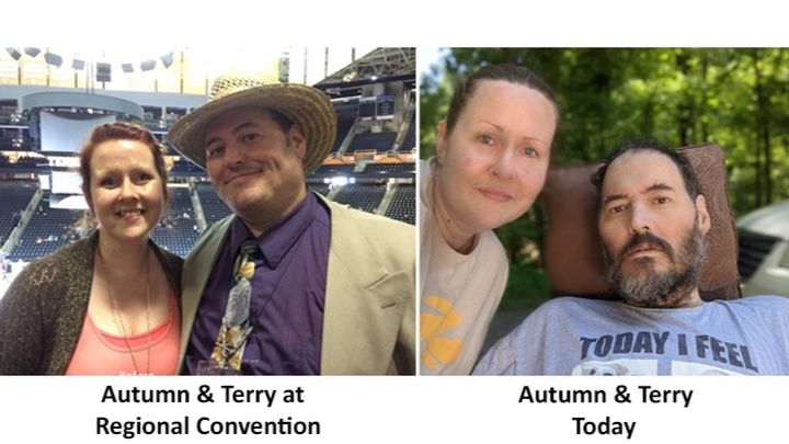 My name is Autumn McCormick, and my husband is Terry McCormick. We will be married 20 years in June. We are members in good standing of the South Asheville congregation. Here is a picture of us at a pre-pandemic regional convention, which shows how Terry looked until recently and a more recent photo of us both, showing his current health difficulties.