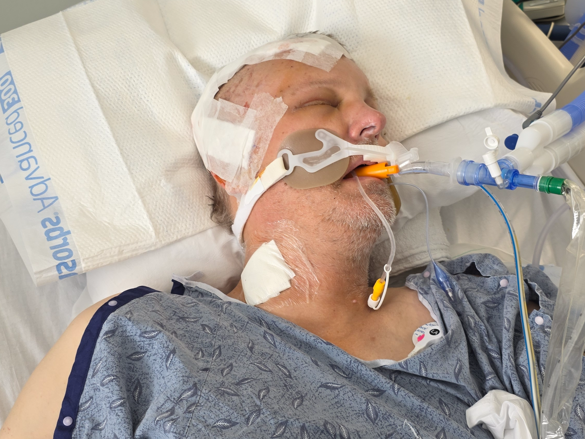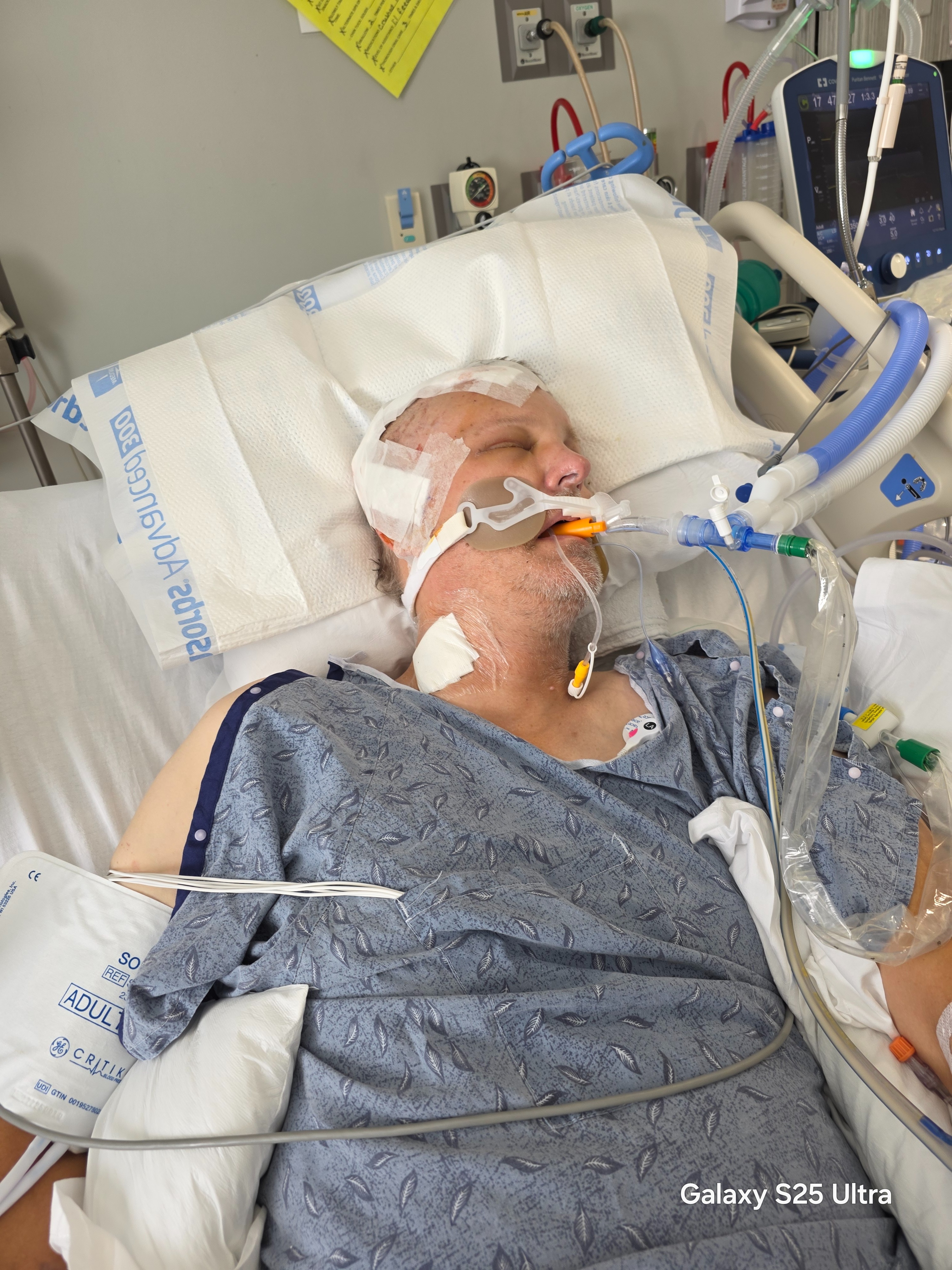 The right hemisphere of his brain swelled so much that it started pushing against the left side of his brain, essentially, "squishing" his left brain between the swelling right brain and the skull. So he had to have emergency surgery to remove the right half of his skull to relieve the pressure. Had they not done the surgery, he would have died. The surgery was successful, and he remains in the Neuro-ICU. They expect him to be there 2-3 weeks and then move to a regular hospital room to undergo his initial physical and occupational therapy. After that, he will be moved to a rehabilitation facility for more extensive physical and occupational therapy.