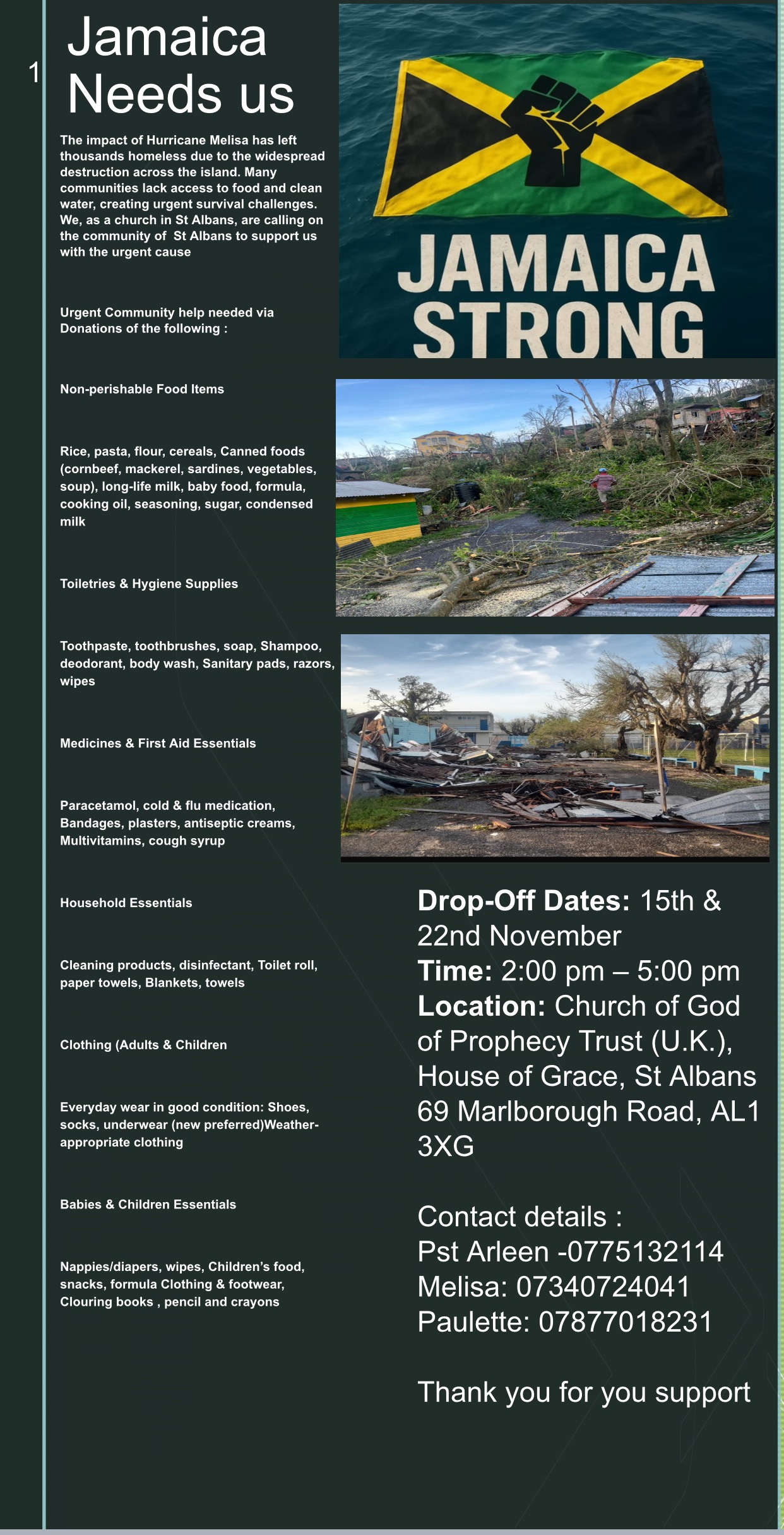 In light of the recent devastation caused by Hurricane Melisa in Jamaica, particularly affecting Manchester, Westmoreland, and St Ann's, I am reaching out to gather support for those in need.