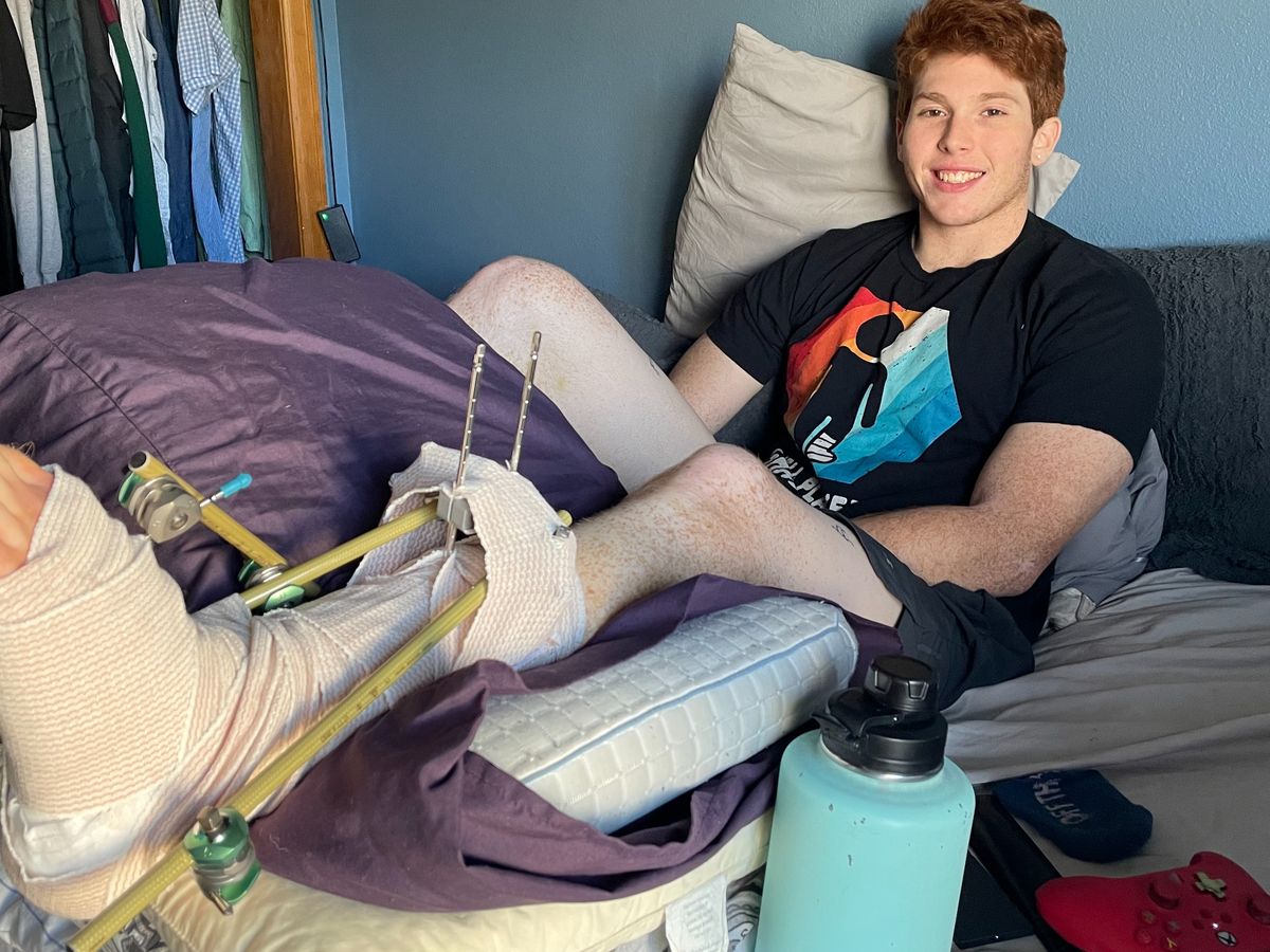 his left ankle was shattered in the fall to the basement floor. His tibia slid off his foot, his talus bone dislocated 180 degrees and fractured, his subtalar joint dislocated and fractured, and there are other fractures. He had to have emergency surgery that evening to prevent the loss of the limb, and he has been largely immobilized since then with external hardware holding everything in place. To regain the use of his foot and ankle, he recently underwent an additional surgery on April 1, 2022.