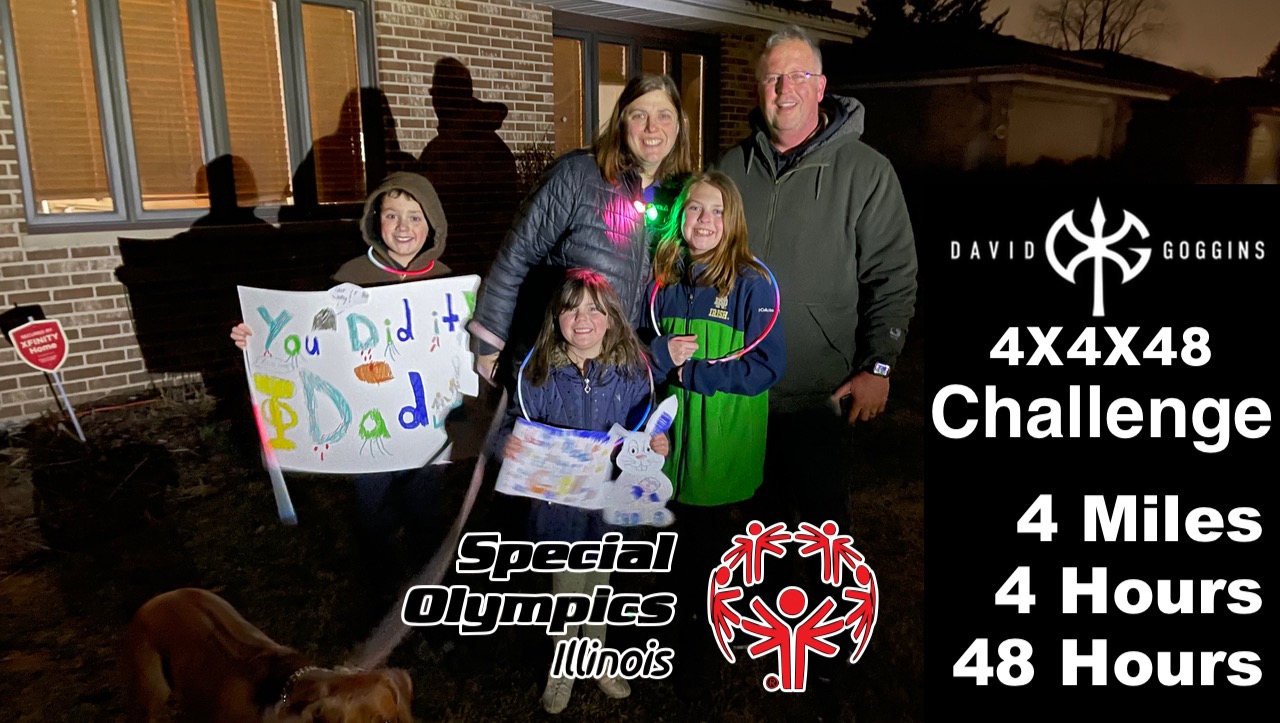 Starting on March 4th at 10pm, I will be participating in my 2nd Goggins 4x4x48 Challenge raising money for the Special Olympics Illinois and I am asking for your support! The Goggins 4x4x48 Challenge is walk/run 4 miles every 4th hour for 48 hours straight which will end with the 12th round at 6pm on Sunday, March 6th.
