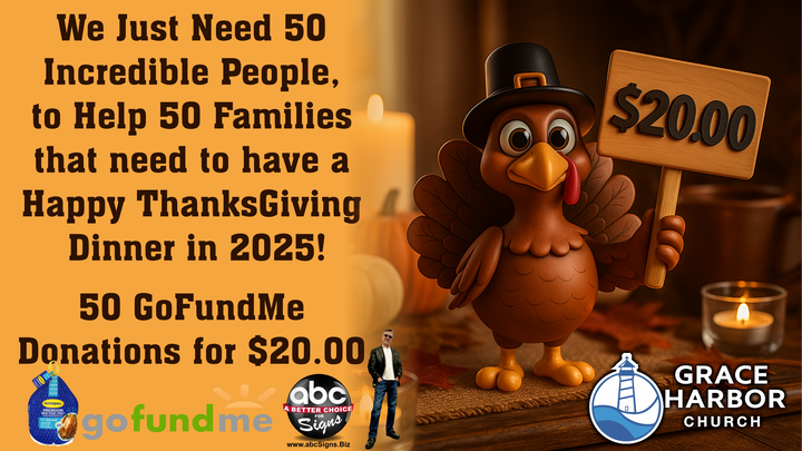 Hi, I am Greg Callahan and I’m helping my lovely wife Lisa with a small fundraiser for her church, Grace Harbor, here in Mobile. During Thanksgiving, countless families are unable to have a true Thanksgiving dinner, Lisa told me that her church was taking donations to build a complete box with everything needed for a perfect Thanksgiving dinner for 50 needy families. So I decided to put this GoFundMe page because I have done a few before and wanted to ask 50 friends, families & business associates to donate $20.00. This is going to purchase the most expensive part of the package which is a large turkey that is big enough to feed 7 to 12 people. Grace Harbor is currently handling all of the other necessities and delivery. Thanking you in advance and we all wish you and your family a very Happy Thanksgiving! Greg & Lisa Callahan ~ Owners abcSigns