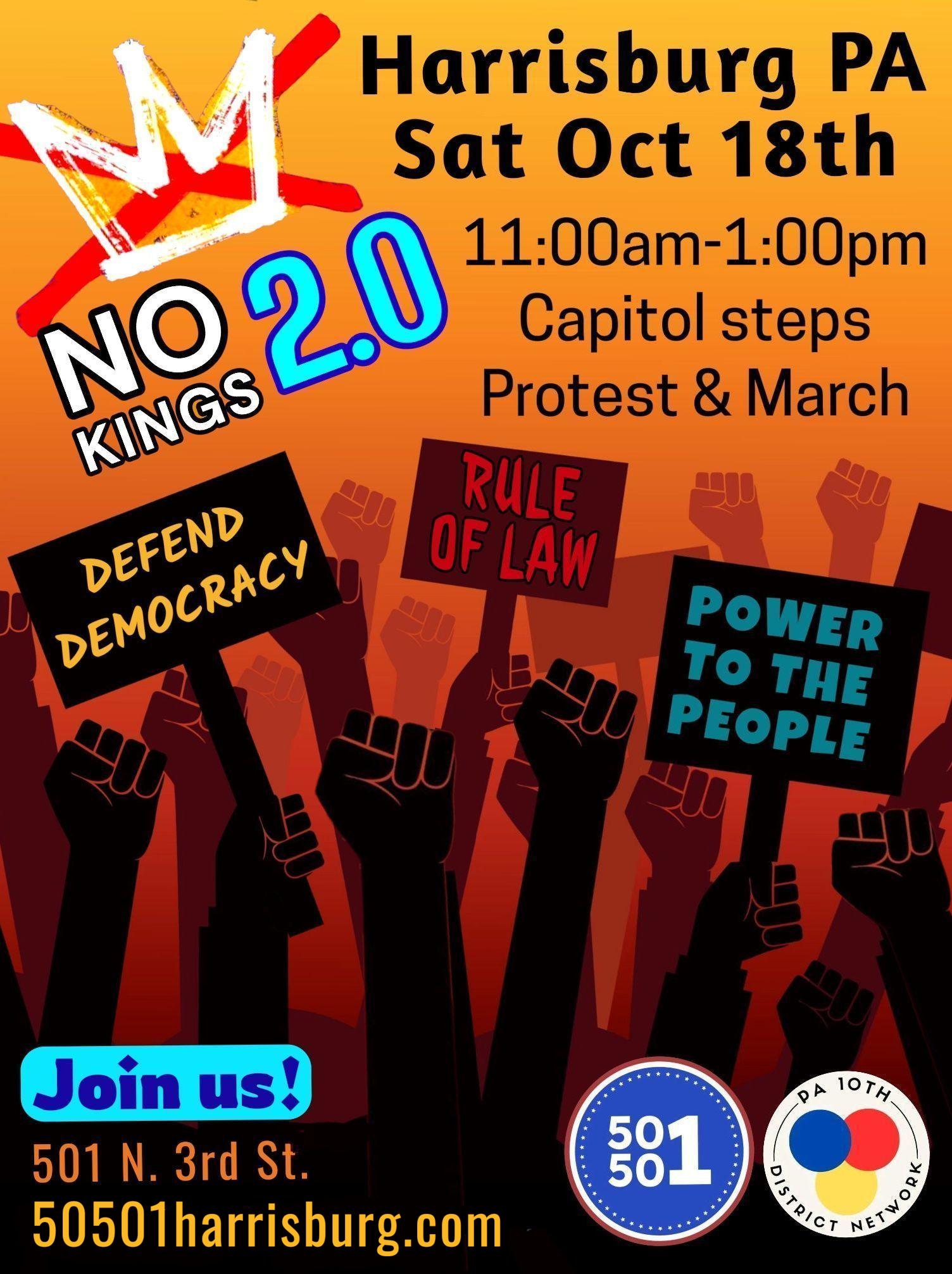 We’re 50501 Harrisburg, a grassroots movement of everyday people who in early February of 2025 saw a need and showed up. We’ve organized 11 major protests in Harrisburg so far, bringing out thousands in defense of justice, democracy, human rights and to say NO KINGS!