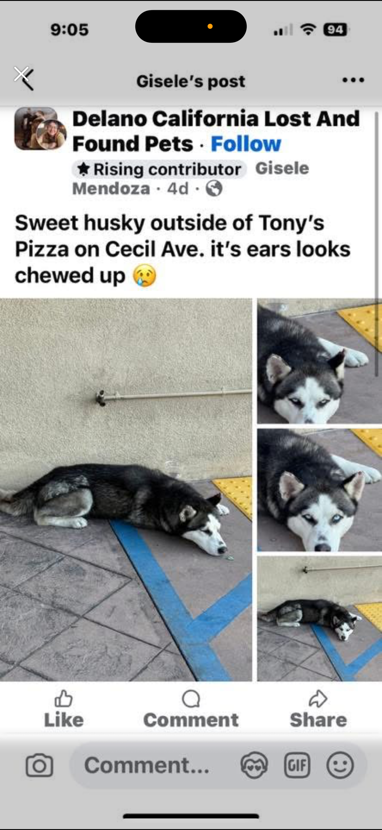 Hi! My name is Ally and with my Husband Ken we drove a lot last night to safe a husky from living on the streets once we found out he has been there for almost a month just laying there and his ears were half eaten by flies , we live very far away from where he was at , Delano , California and we live in Orange County , someone amazing helped us bring him closer to us and now we have him at a boarding place until we can go get him but we are getting updates on how he is doing , we are paying for all the costs including boarding but we need help , we want to get him fixed and get his situation with his ears handled