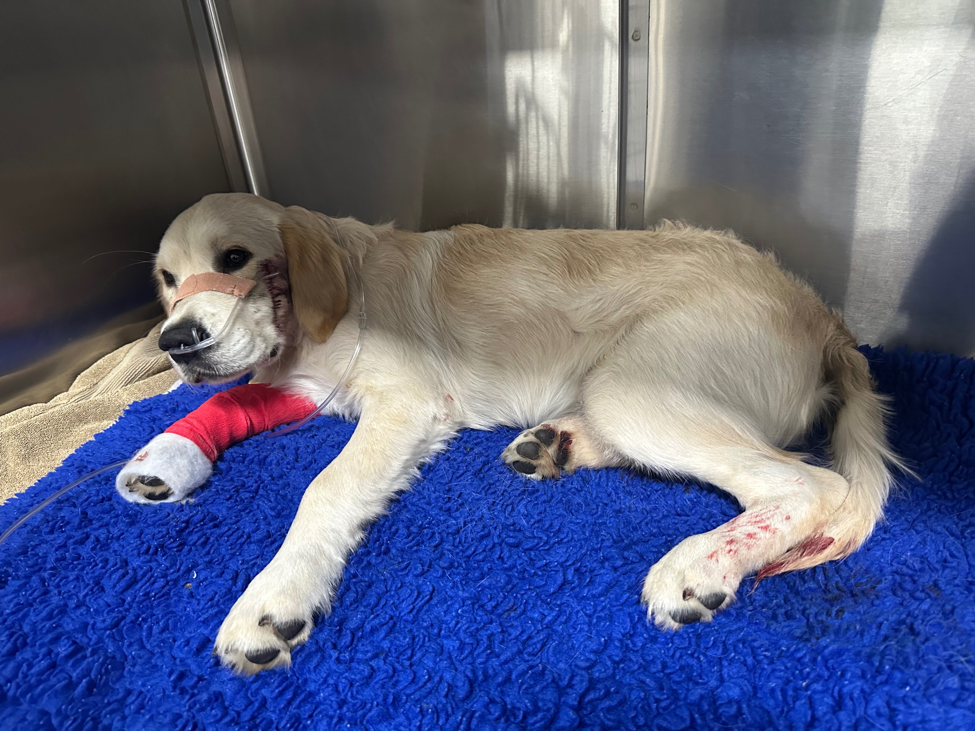 Dusty is now at the Animal Hospital in Essendon Fields receiving urgent medical care. He has serious lung injuries from the impact and may require several days on a respirator to support his breathing. The incredible vets caring for him have warned us that the next 24-48 hours are critical. Like a severe bruise, the internal damage may worsen before it improves.