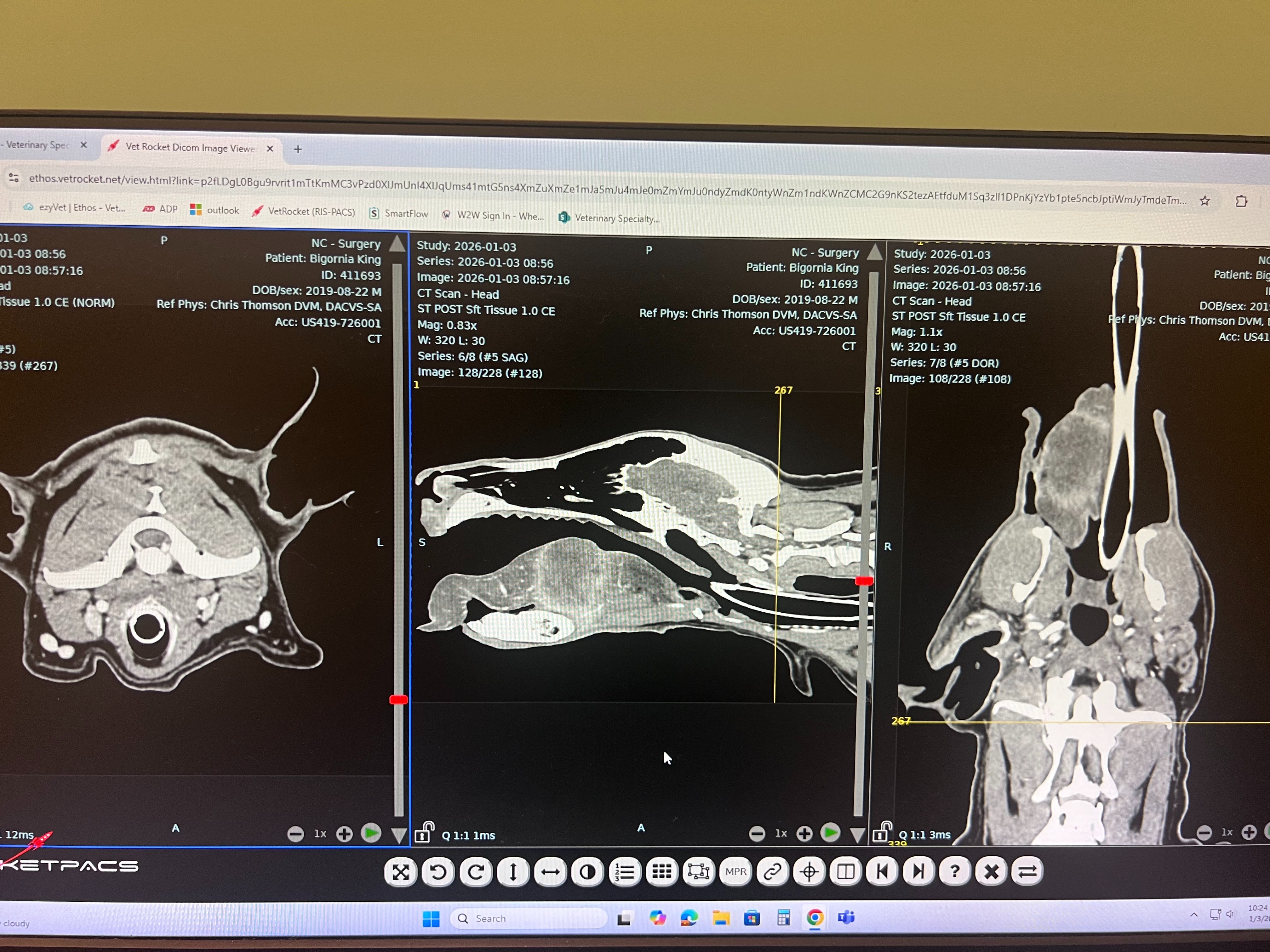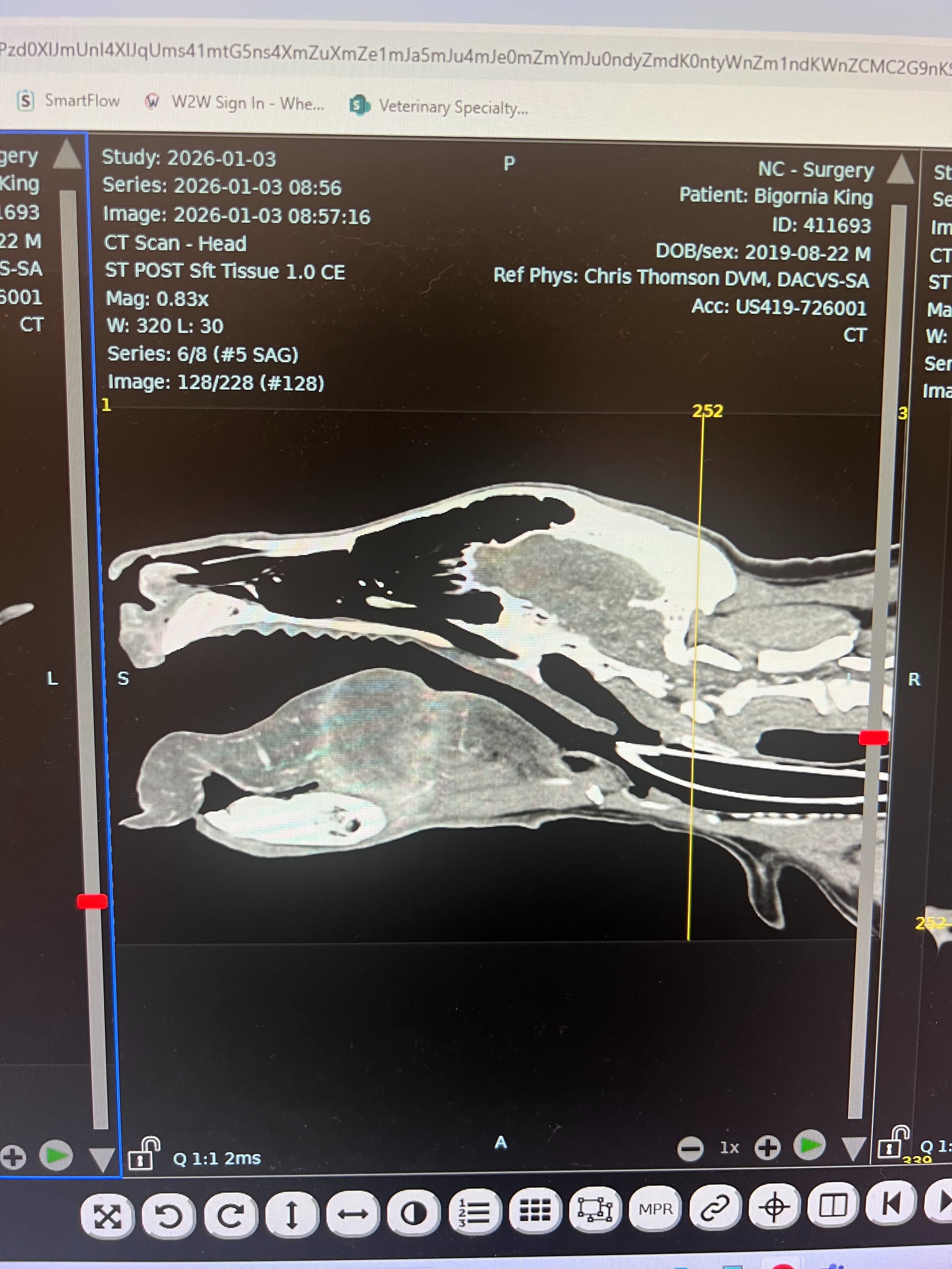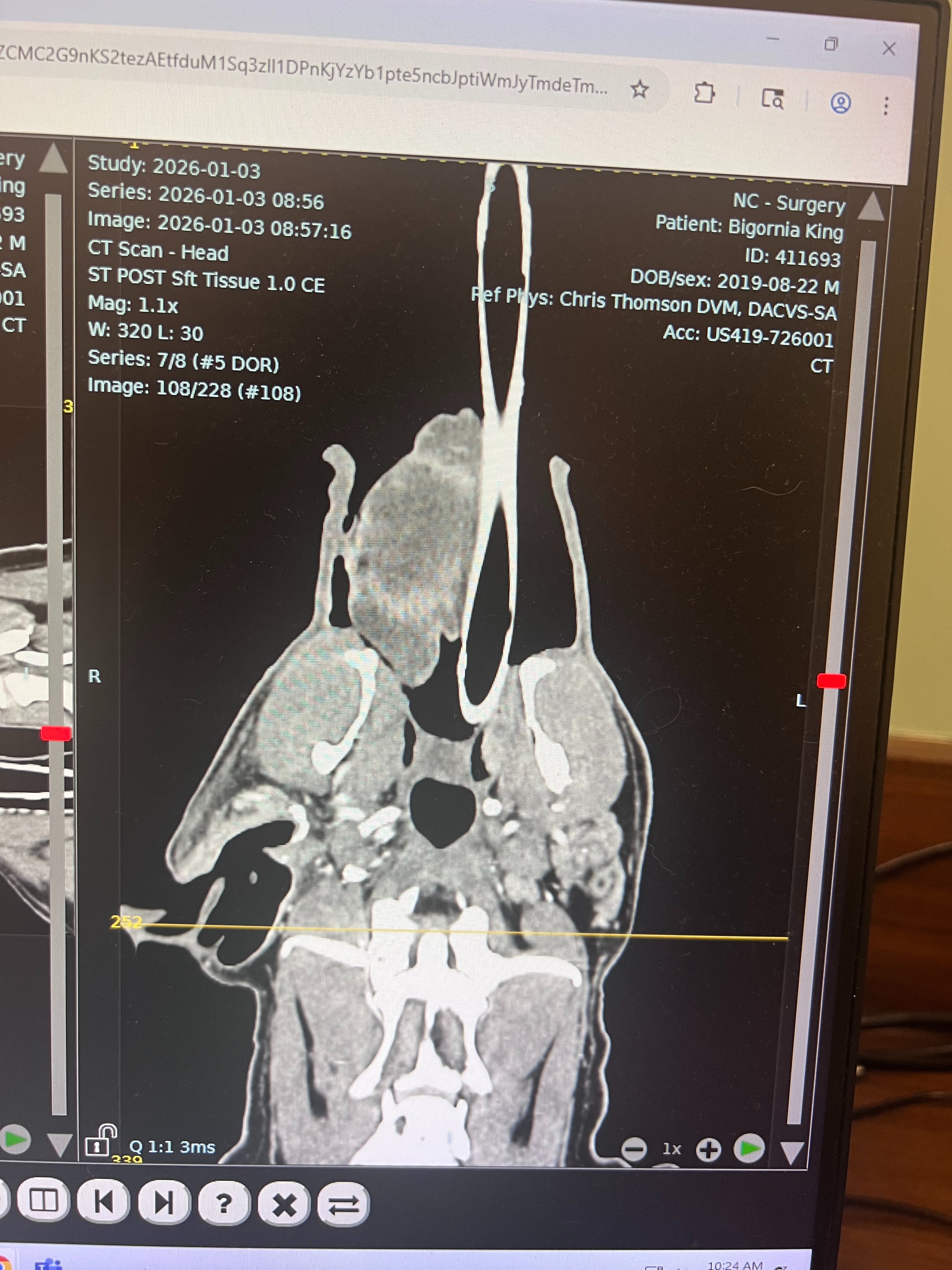 A CT scan was performed this morning, and there are 3 areas of concern: his ear has a large fluid-filled mass, his tongue has a large fluid-filled mass, and he also has a mass on his muzzle. The top rule-outs at this point are autoimmune disease, bacterial infection, or a fungal infection.