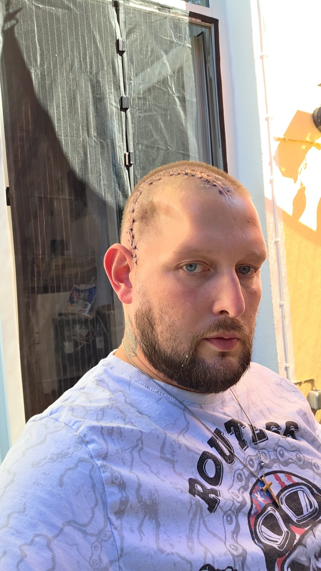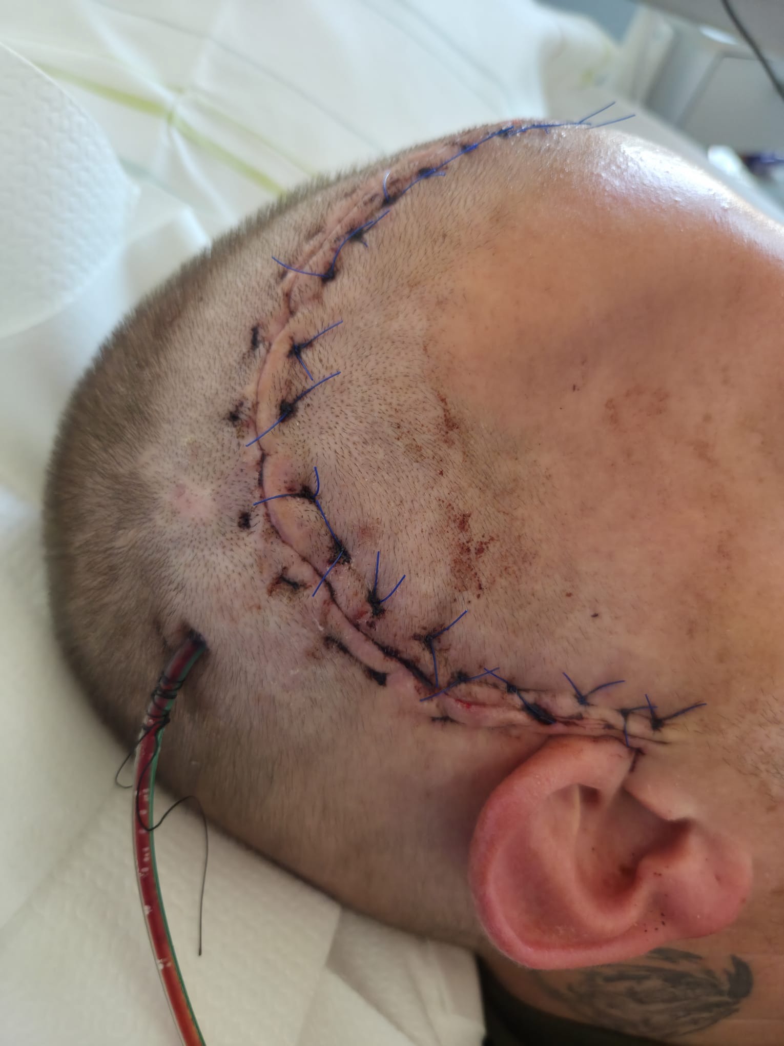 Dies musste dann aber auf Eis gelegt werden ,da sich die Narbe am Kopf an einer Stelle nicht geschlossen hatte und Keime eindringen konnten.