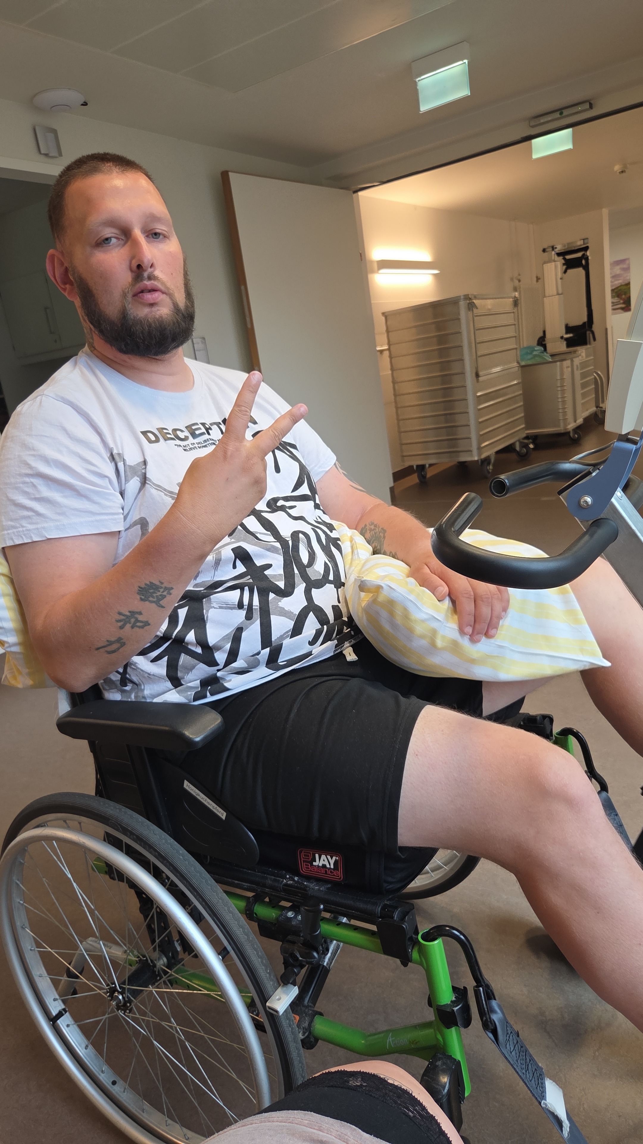 Nebenbei macht er noch Therapien um das laufen wieder zu erlernen und seinen Arm zu nutzen.
