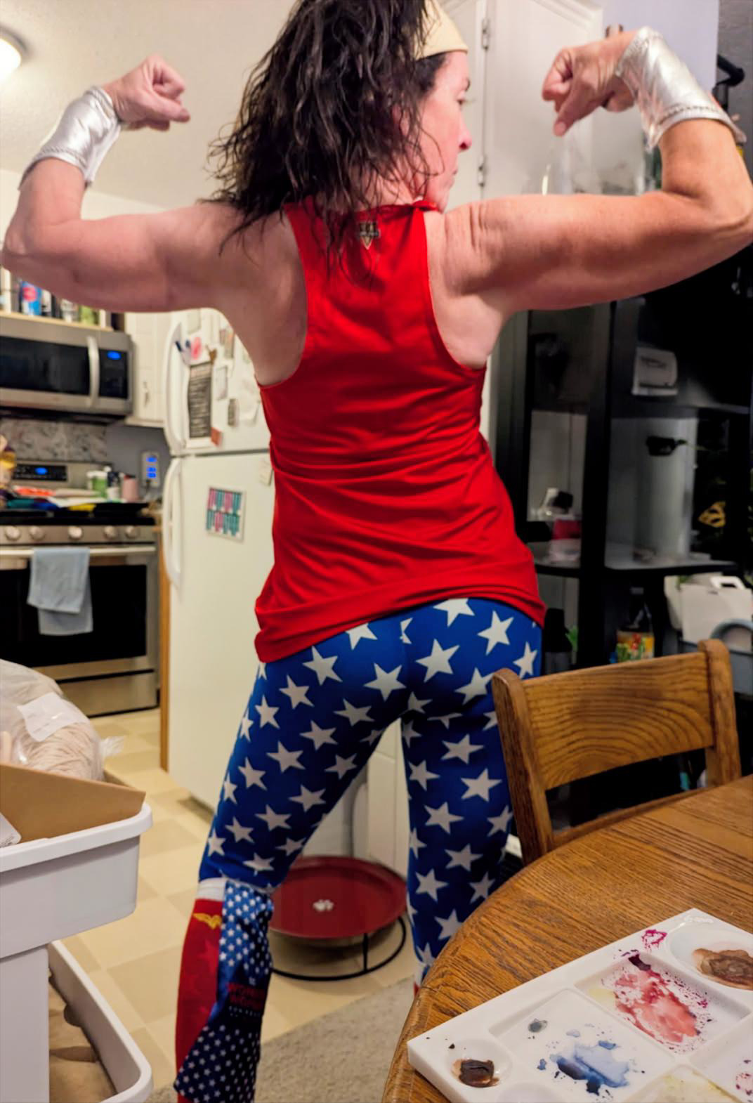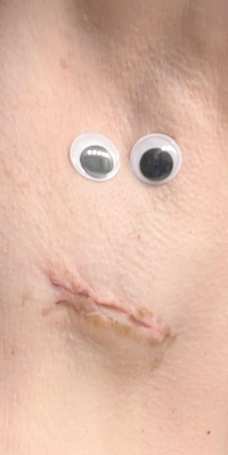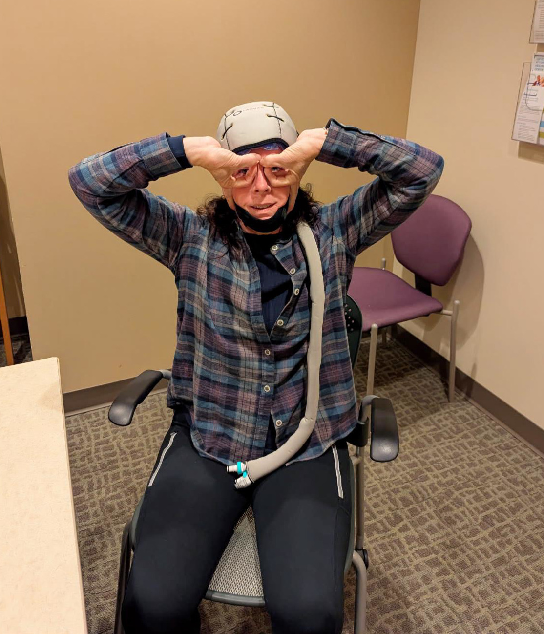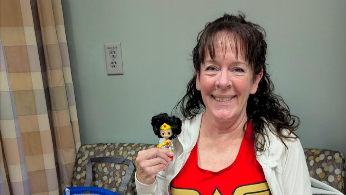 A brave front on a very emotional and scary day. Even though Lisa had a good idea about what this discussion would entail, hearing the words chemotherapy and radiation. Having the side effects explained and realizing they are talking about you is very devastating. I will explain the Wonder Woman theme in a later picture.