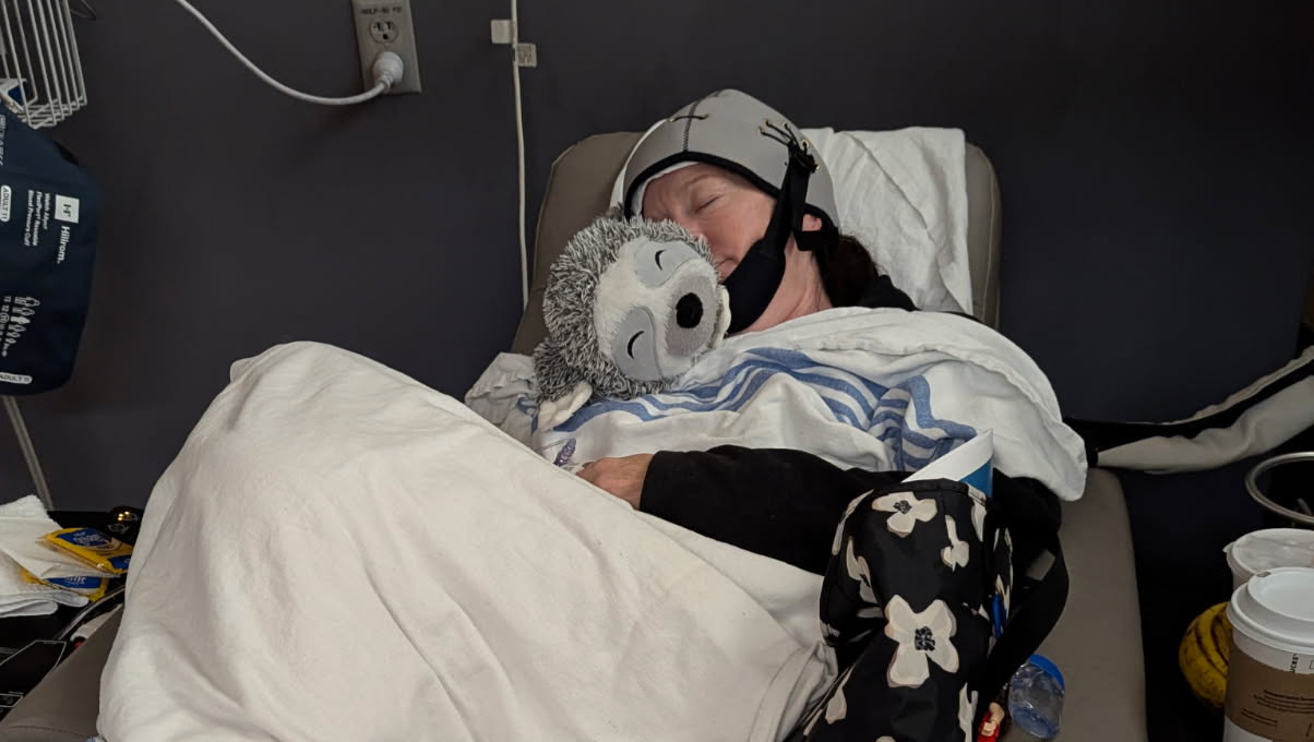 Lisa during a chemo session holding her dog, Gretzky’s, favorite toy.
