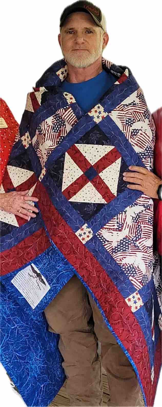Jason is also a veteran who was slightly burned and hurt in the process of trying to put out the fire in attempts to save the house. (Last image is of Jason receiving a Quilts of Valor Quilt.)