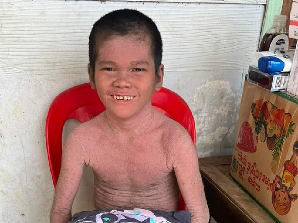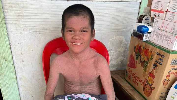 This is poor Hon Panha who is 12 years old. Panha was born with a rare incurable skin condition which leaves his skin dried out, in constant need of scratching and leaving sores all over his tinny body. Doctors have no cure for him and he is left to suffer in agonizing torment as the flies continue to bite and pick at his skin. He lives with his mum in Banteay Meanchey Province Cambodia. A very poor house hold and his mother struggles just to feed him. His father left the family when he was only 3 months old. Panha's mum rents 3 wall shack from an uncle while she has her own land, but no means for a structure.