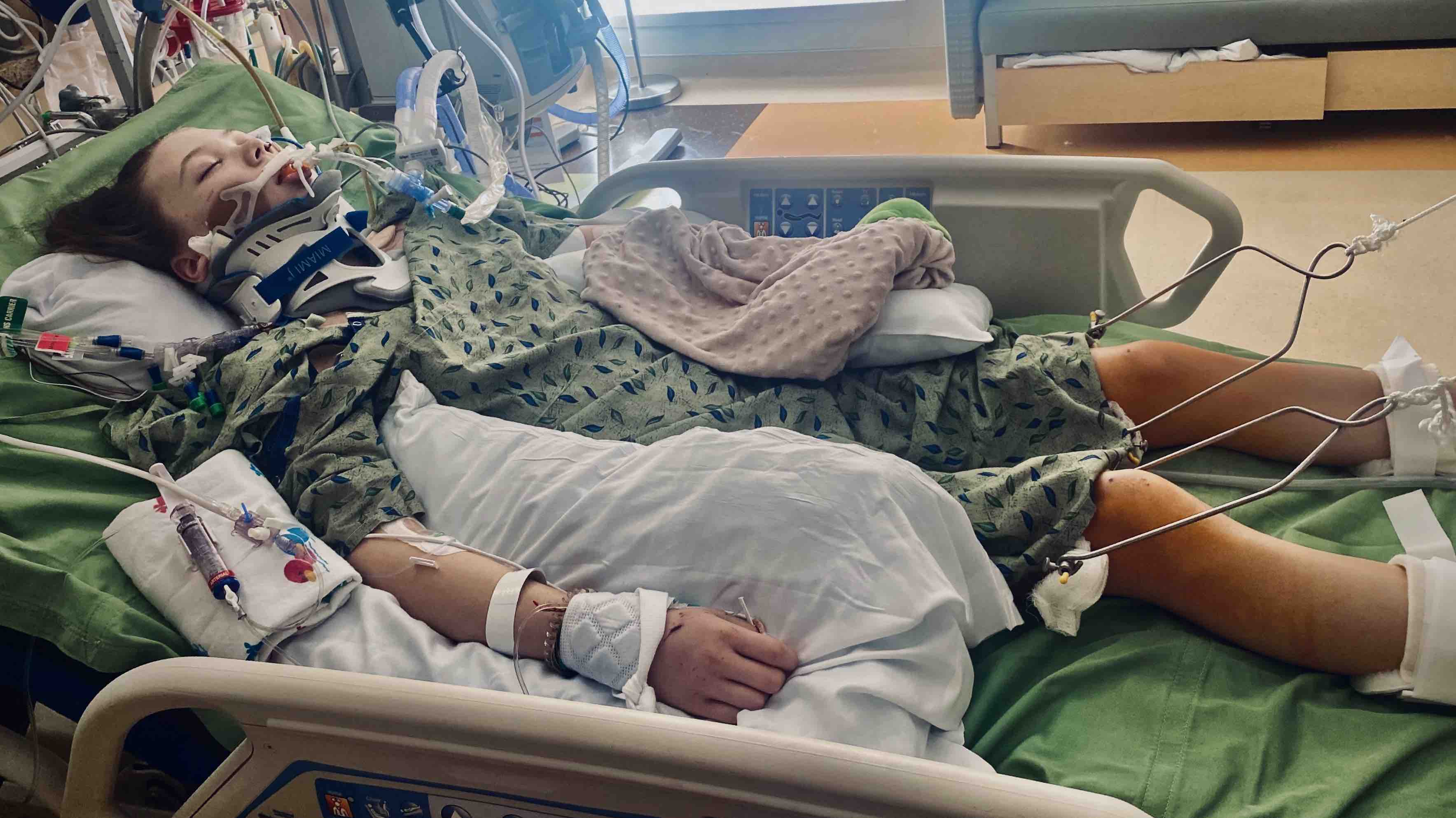 Paige was intubated at the scene and received many units of blood products. Due to blood loss, her blood pressure was low and she was started on norepinephrine. Upon arrival, Paige was sent straight to the OR with both trauma and orthopedic surgery teams. She had Right sided pulmonary contusion and pneumothorax. X-Ray showed her Pelvis had multiple fractures, multiple fractured ribs, Lumbar transverse process fractures, and sacral fractures. CT scan showed splenic rupture with active bleeding and her spleen was immediately removed. CT scan also showed liver laceration, kidney laceration, pulmonary lacerations, and pulmonary contusions. Paige received many blood products in surgery also. Bilateral Femoral Traction pins were placed for the management of pelvis fractures and she was brought to Gillette PICU for management.