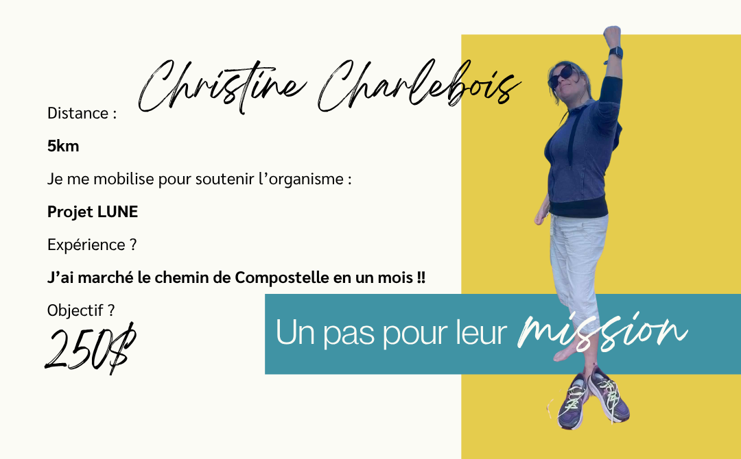 Il y a longtemps, Christine a marché le chemin de Compostelle. Ça lui a pris un mois. Aujourd’hui, elle accélère le pas pour courir 5km d’une traite. C’est un peu plus que ses 3km habituels, mais pour soutenir une cause, elle est prête à se lancer !