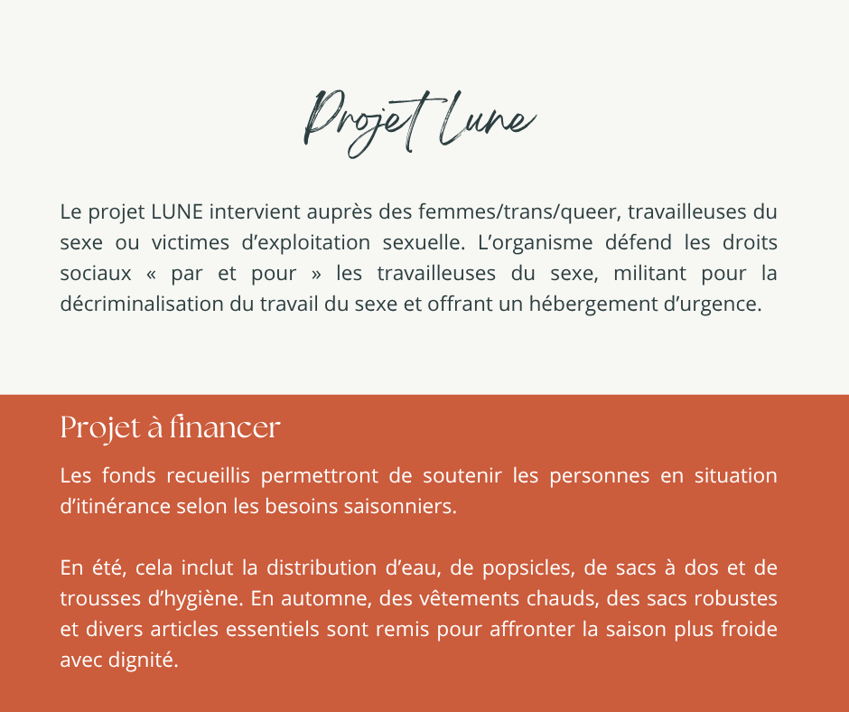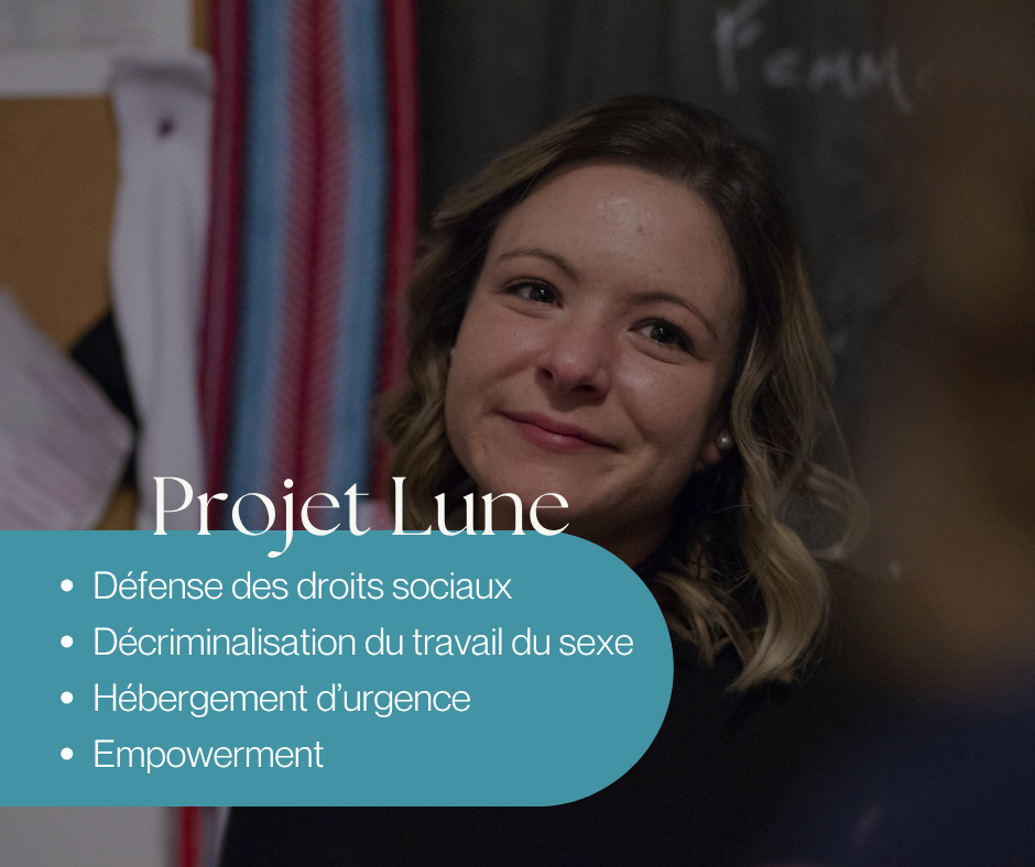 Le projet LUNE est un organisme qui œuvre auprès des femmes, personnes trans et queer, travailleuses du sexe ou victimes d’exploitation sexuelle. Avec elles, il défend les droits sociaux, milite pour la décriminalisation de leur travail et s’assure de leur offrir un hébergement d’urgence.