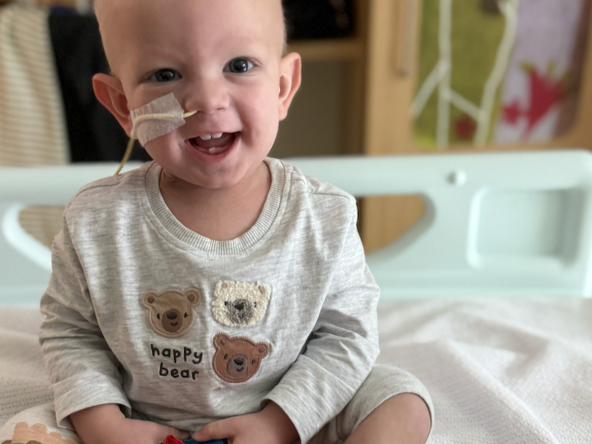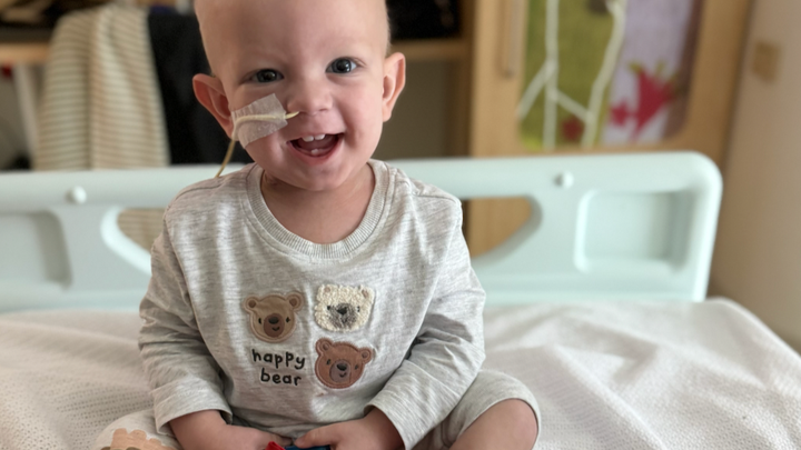 Ollie has endured more general anaesthetics than most people face in a lifetime. He has had countless scans and tests, lives with a Hickman line in his chest as well as a nasogastric tube in his nose. Yet he carries on learning to crawl, walk and play with Huddy while maintaining his cheeky grin.
