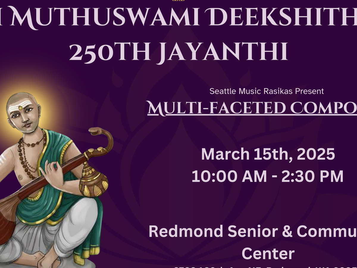 The Greater Seattle Area Music Rasikas invite you to be part of a once-in-a-lifetime celebration honoring the 250th Jayanthi of Sri Muthuswami Deekshithar, one of the Trinity of Carnatic music.