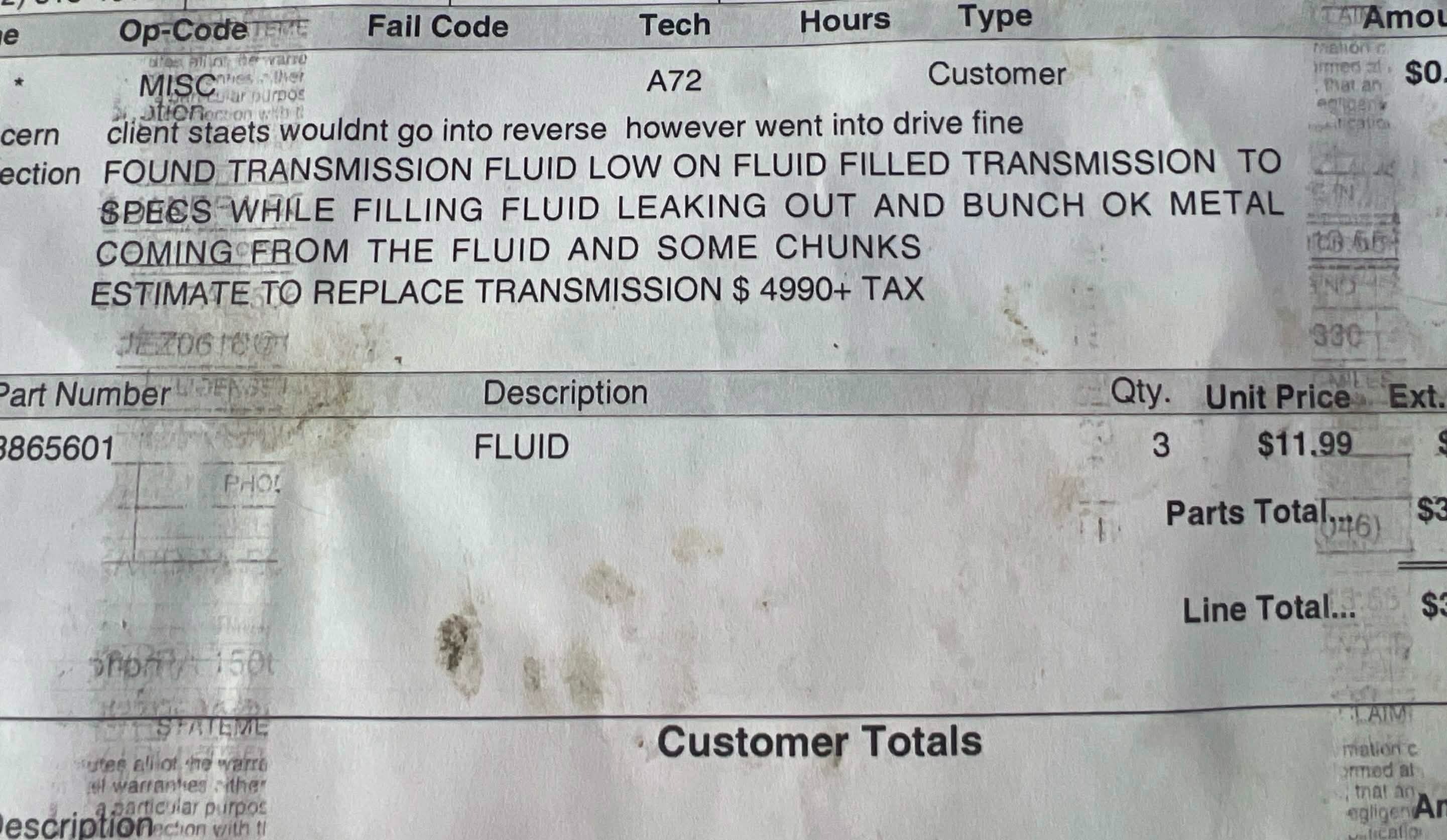When the tech looked at the care he said that it was leaking fluid and when he tried to put more in it started leaking and metal was coming out as well. The estimate is $4,990 plus tax.