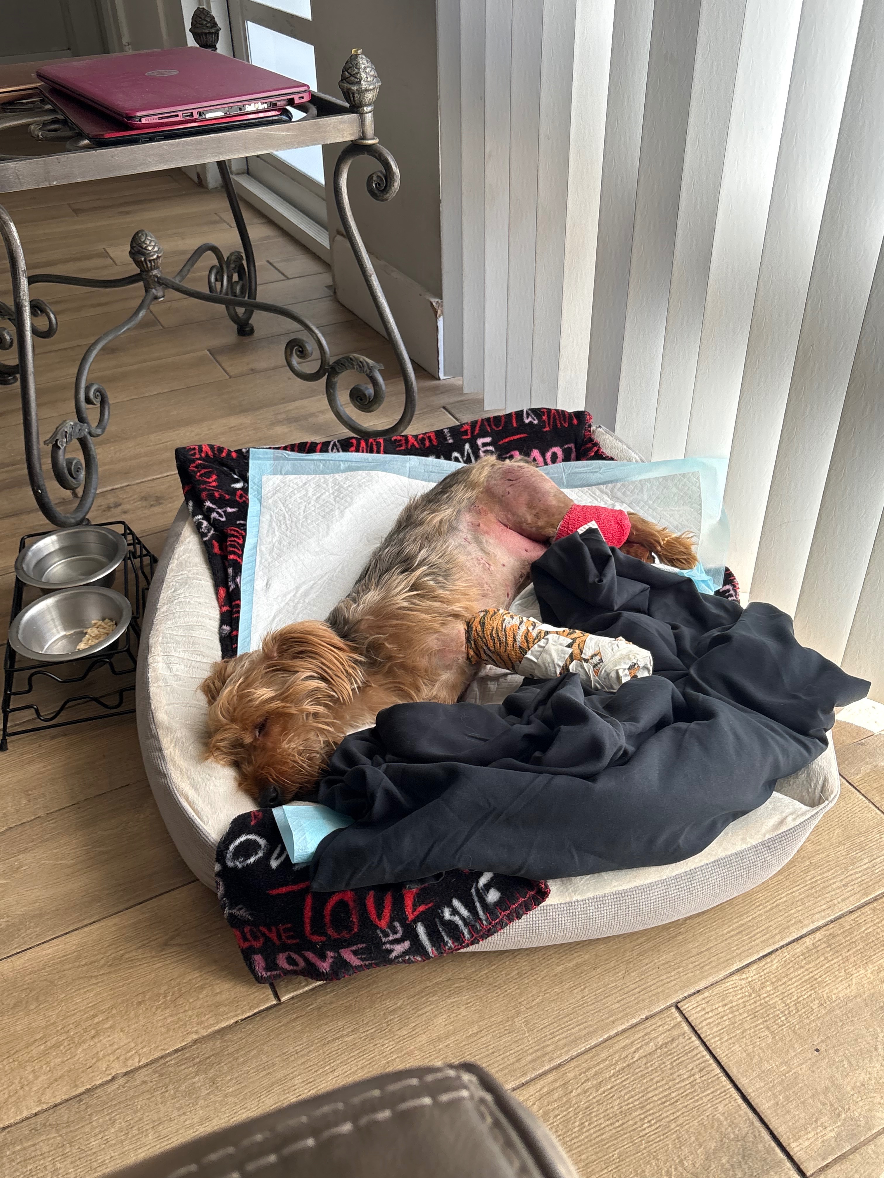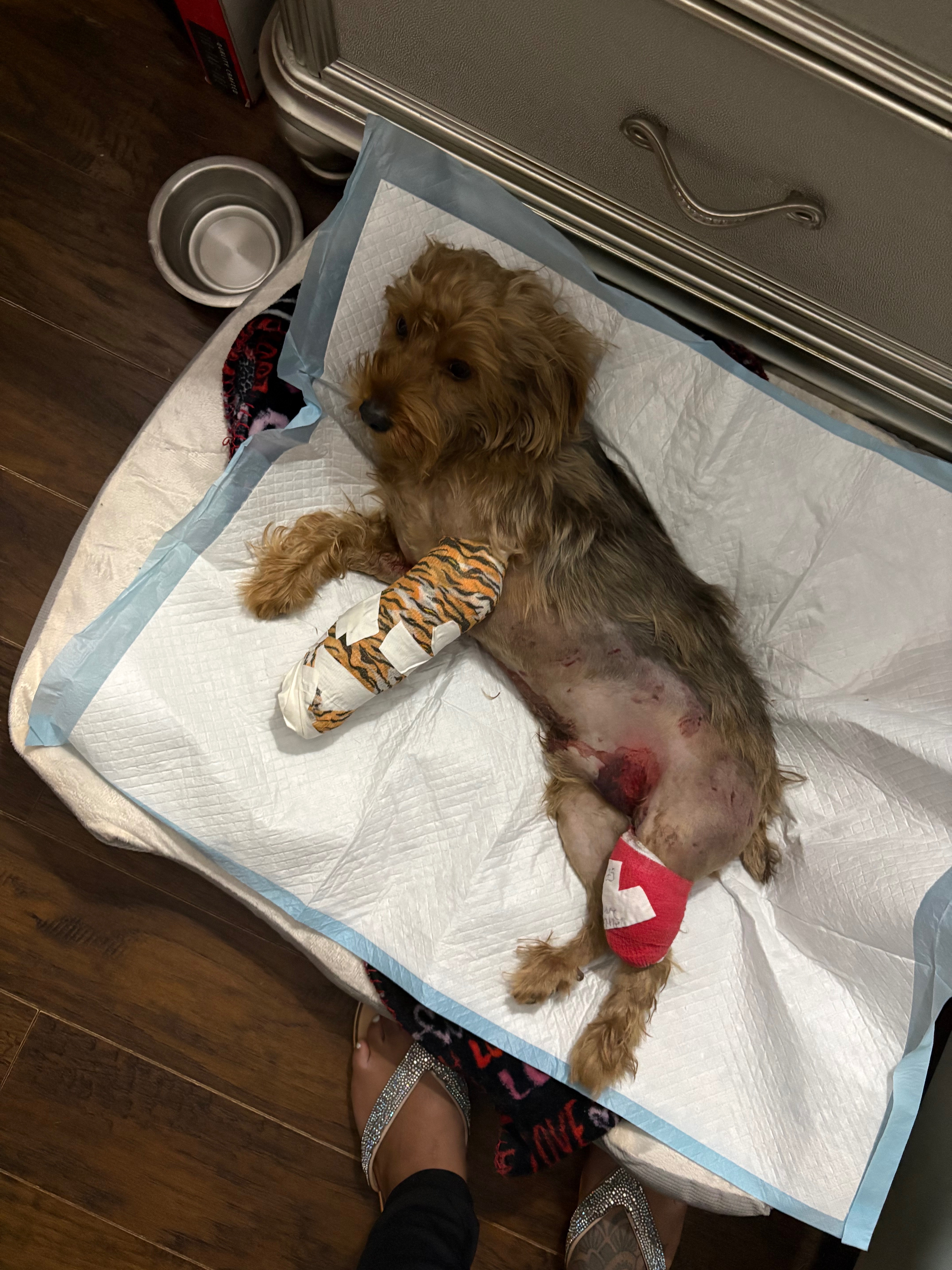 Kash accidentally dug a hole under our fence and got into a neighboring yard, where he was attacked and severely injured. As a result, he suffered a broken arm and multiple open wounds. One of his wounds has become infected, making his condition even more serious. We rushed him to the vet, and they have told us he will need surgery, daily bandage changes, and rehabilitation in order to heal properly.