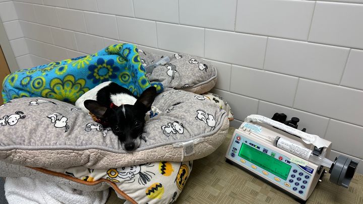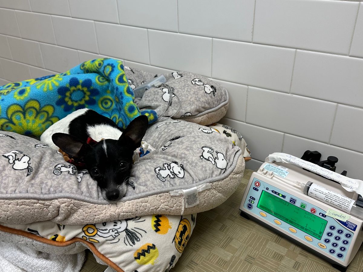 Chico did well for the next 5 days. We continued his physical therapy, we even did some water therapy with him as recommended him the Neurologist at Guardian. He was doing quite well, until the night of April 3rd. That day, Chico’s foster noticed he seemed a little off. He didn’t seem like himself, he was barking a lot more than normal and just wanted to lay in his bed. A storm was coming in late that night so we thought maybe it was just the weather. Dogs can sense storms before they even come. At 11:58pm on April 3rd Chico had to what appeared to be a seizure. His neck hyperextended, his legs were paddling and his eyes were shaking. It lasted for about 30-45 seconds. I waited for it to finish then picked him up. He was alert and conscious following the episode. I held him for a bit and laid him back down and he immediately went into a second episode. This one lasted about the same time but was a little worse than the first. After the second episode his left eye became lazy, it didn’t react to light and would not follow movement. At this point, the impending snow/ice storm was in full effect and the roads were in hazardous condition. There was no way I was getting him 2.5hrs away to Guardian. I called Guardian to let them know what was going on, they informed me that if he has a third seizure he needs to be seen somewhere immediately. I gave Chico a gabapentin around 1AM on 4/4/24 as he appeared to be in pain. I placed him in a sternal position in his bed and checked on him throughout the night. When I woke up that morning, he was not ok. His body was cold and stiff. He couldn’t move any of his legs or his neck. I called around to local vets in the area to see who was open given the active storm. I brought Chico to Sturbridge Veterinary Hospital as they were open and also had an urgent care. We arrived there and the vet assessed his condition quickly and informed me that he needs to be brought to Tufts immediately. She called over to Tufts to let them know we were coming and that the Neurologist was waiting for him. On the way to Tufts, I then again called Guardian to inform them of what was going on, they agreed to the plan of care and wanted him at Tufts immediately.